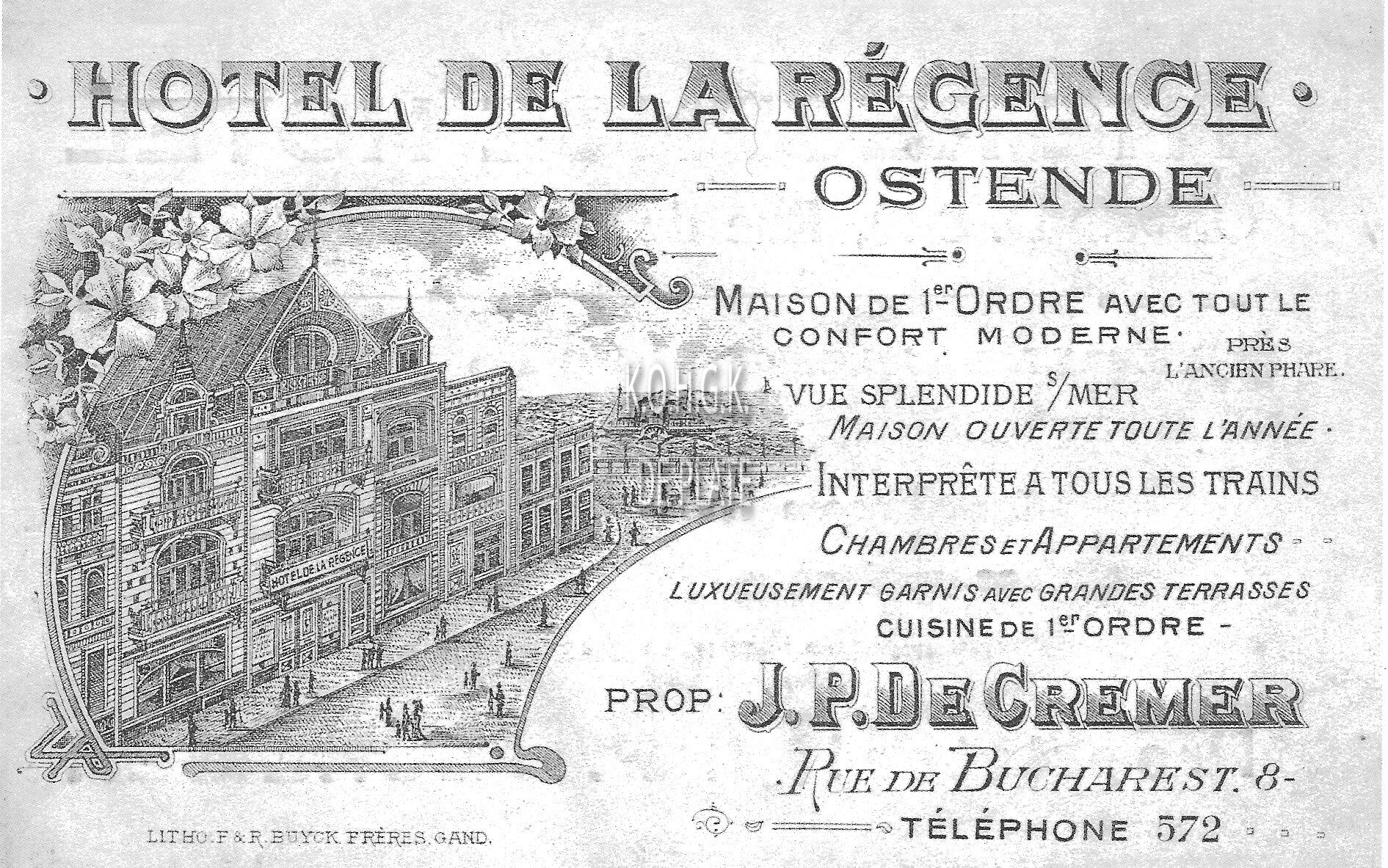 Versierde reclame-prentkaart van het "Hotel de la Régence". Boekareststraat 8. Hotelhouder : J.P. De Cremer