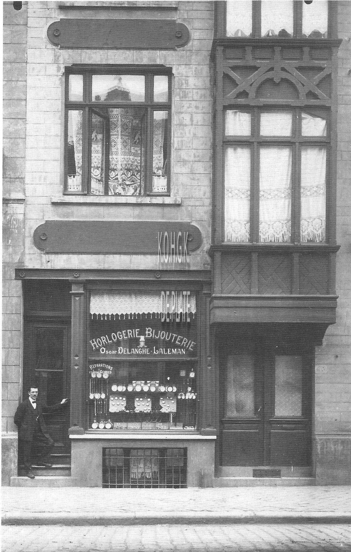 De juwelierszaak van Oscar Delanghe, Alfons Pieterslaan 103. Deze zaak werd opgericht in 1922 en bleef in familiebeheer tot in 1972. Opschrift op uitstalraam : Horlogerie Bijouterie. Oscar Delanghe-Laleman. Let op de prachtig gehaakte gordijnen op het eerste verdiep.