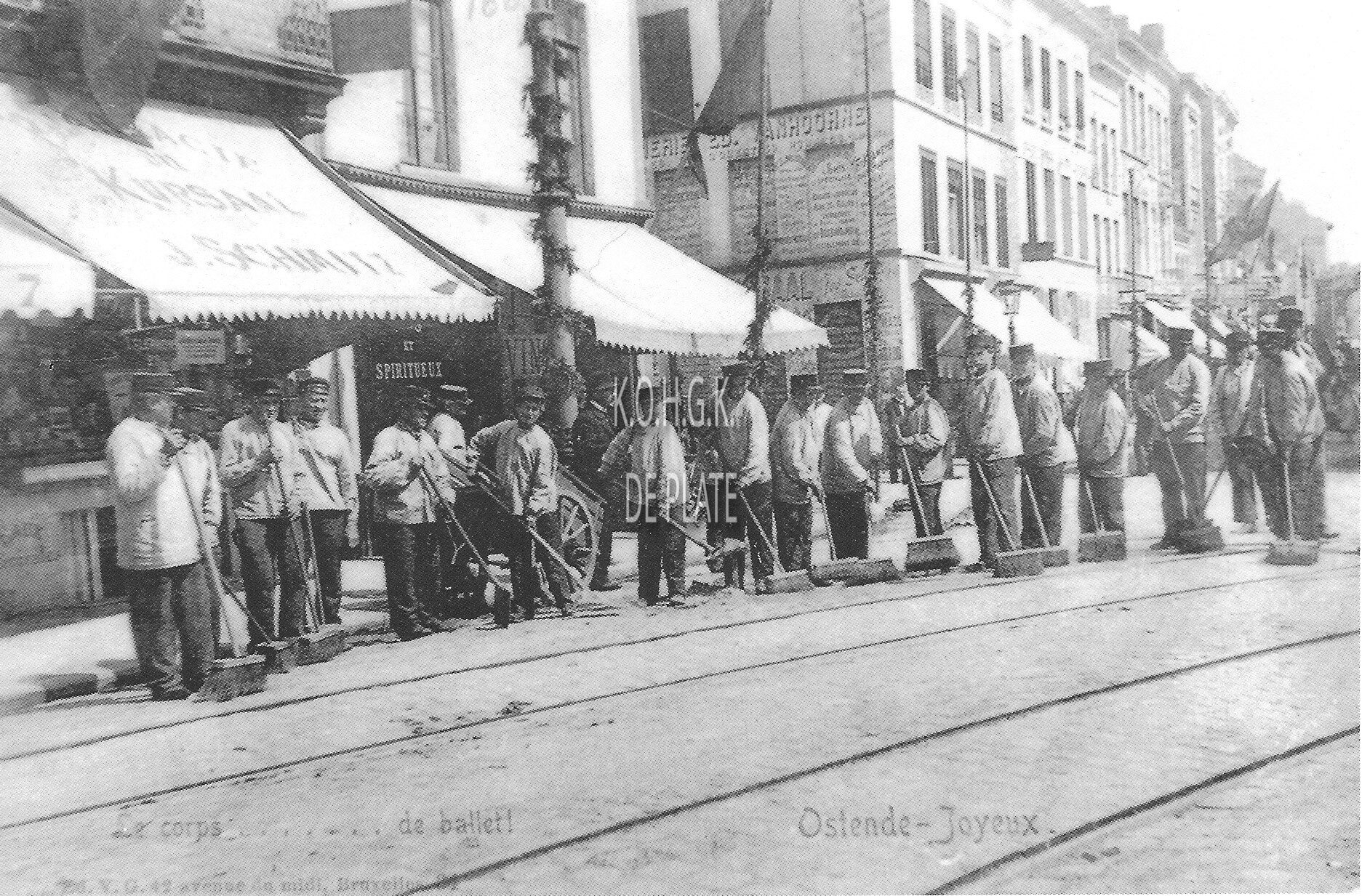 Ijverige straatvegers aan het werk op het Marie-Joséplein. Achter hen, de luifel van de apotheek "Pharmacie du Kursaal". Rechtdoor, de Weststraat en links in het midden, de Madridstraat