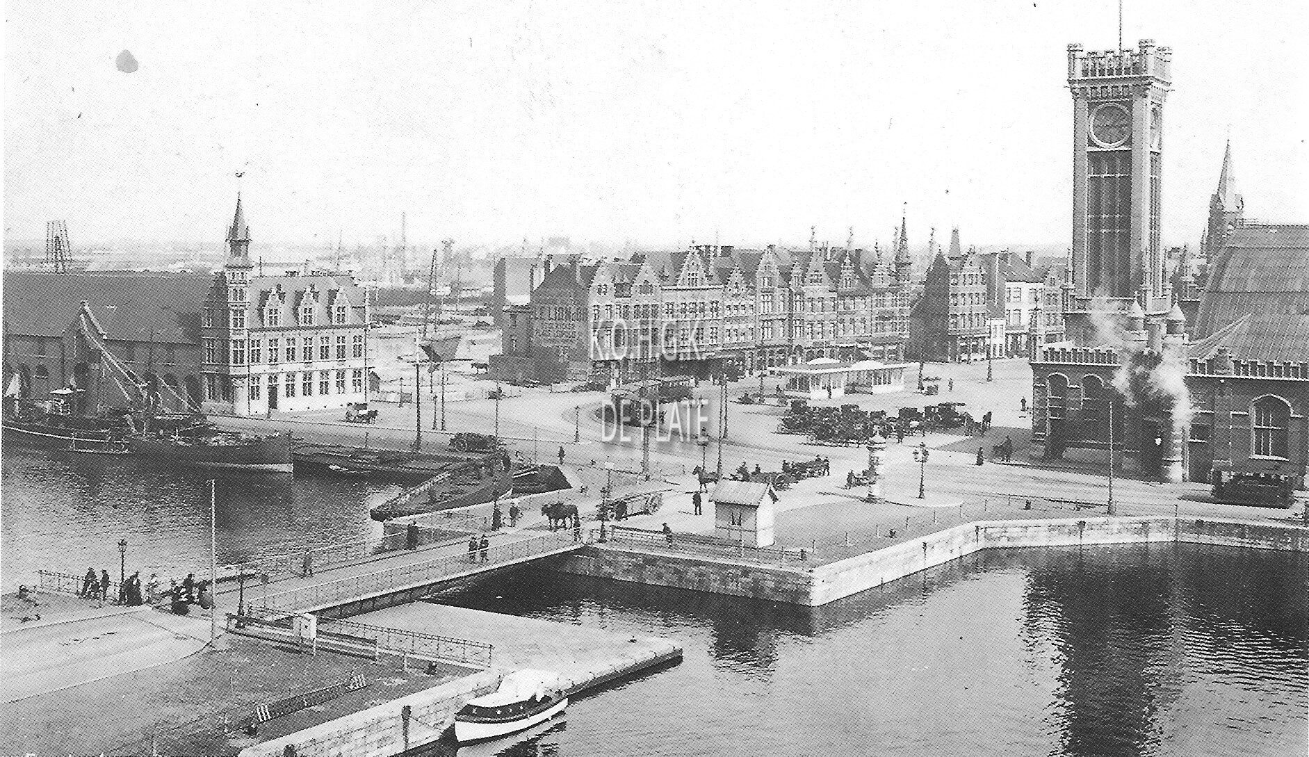 Prachtige opname van het Hazegras, met op de voorgrond de Kapellebrug. Links, het eerste handelsdok en rechts het tweede handelsdok. Op de achtergrond links, het politiecommissariaat en de huizenrij in neo-Vlaamse renaissance stijl, langs de Vandersweepplaats. Rechts, detail van het spoorwegstation.