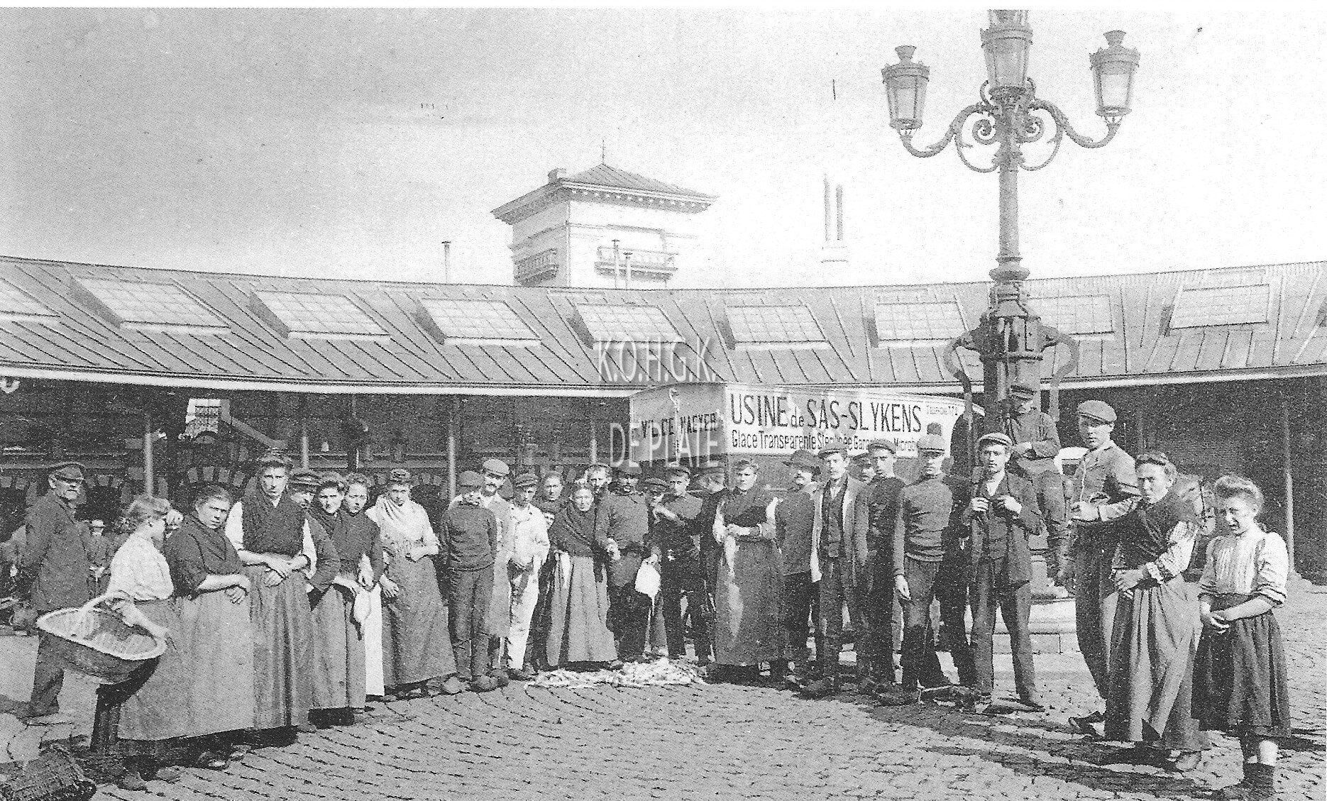 Stemmig beeld van de activiteit in de oude vismijn. Links, het pakhuis van vishandelaar H. Lauwereins.