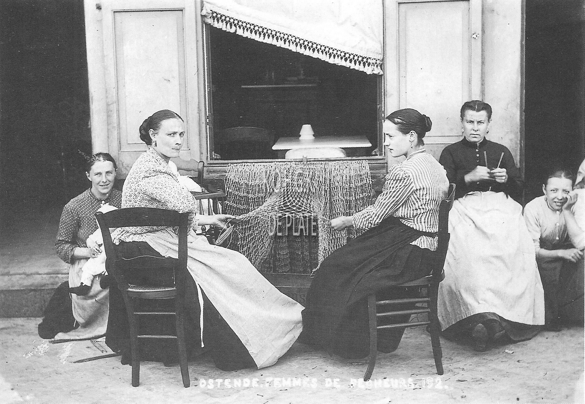 Sfeervol beeld van vissersvrouwen die visnetten breien.