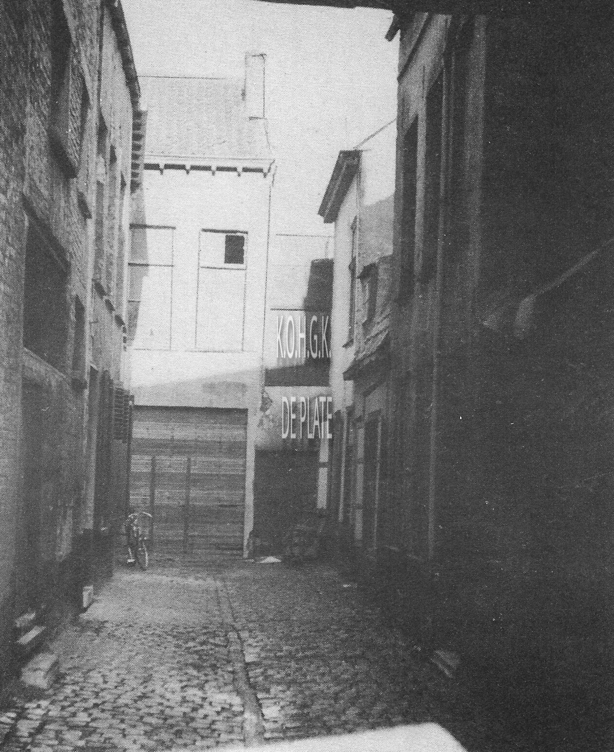 Ingang van de Reinigingsdienst van de Stad Oostende, gelegen rechtover de Waterwerkstraat. We zien het conciërgegebouw (Georges Van Duyvenboden). De beschrijving van de gebouwen in Van Caillie waren een eind verder, nu op de hoek Frère-Orban- en Boogschuttersstraat.