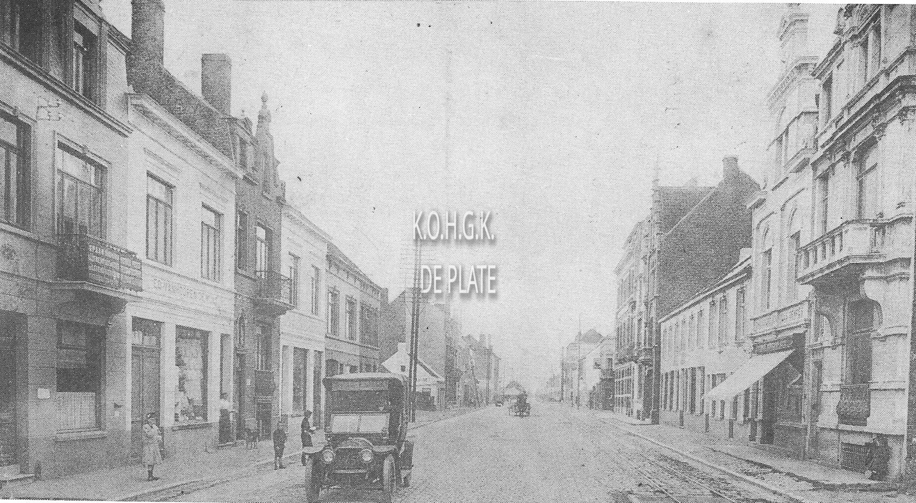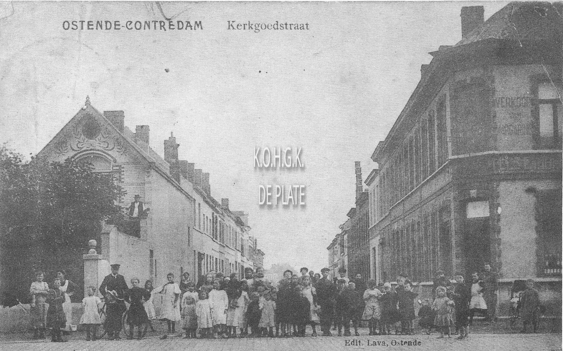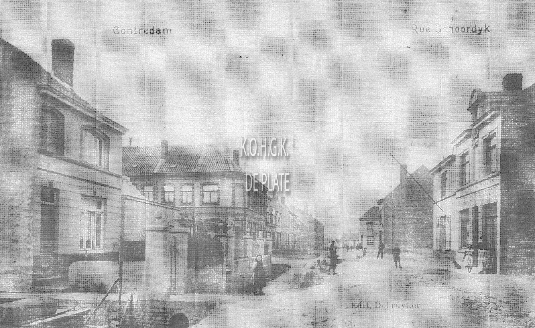 De Zandvoordestraat. Uiterst rechts, café "Zeehaven", met voor de poort de zusjes Irma en Germaine Debruycker met hun moeder Nathalie, ernaast "Café Léopold II". Het postkaartje werd uitgegeven door Casimir Debruycker. Links, de voortuin van Naerts en erachter, de Kerkgoedstraat. Rechts, de Rokerijstraat en erachter, café "De Vier Wegen"