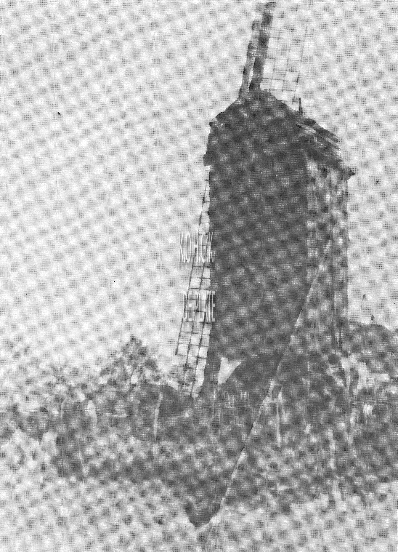 Deze molen werd gebouwd in de 19e eeuw, en was gelegen op de hoek van de Torhoutsesteenweg en de Ledeweg. Deze molen had slechts twee wieken, en werd afgebroken in 1932. Op de foto : Marguerite Sabbe, wonend in het aanpalend huisje