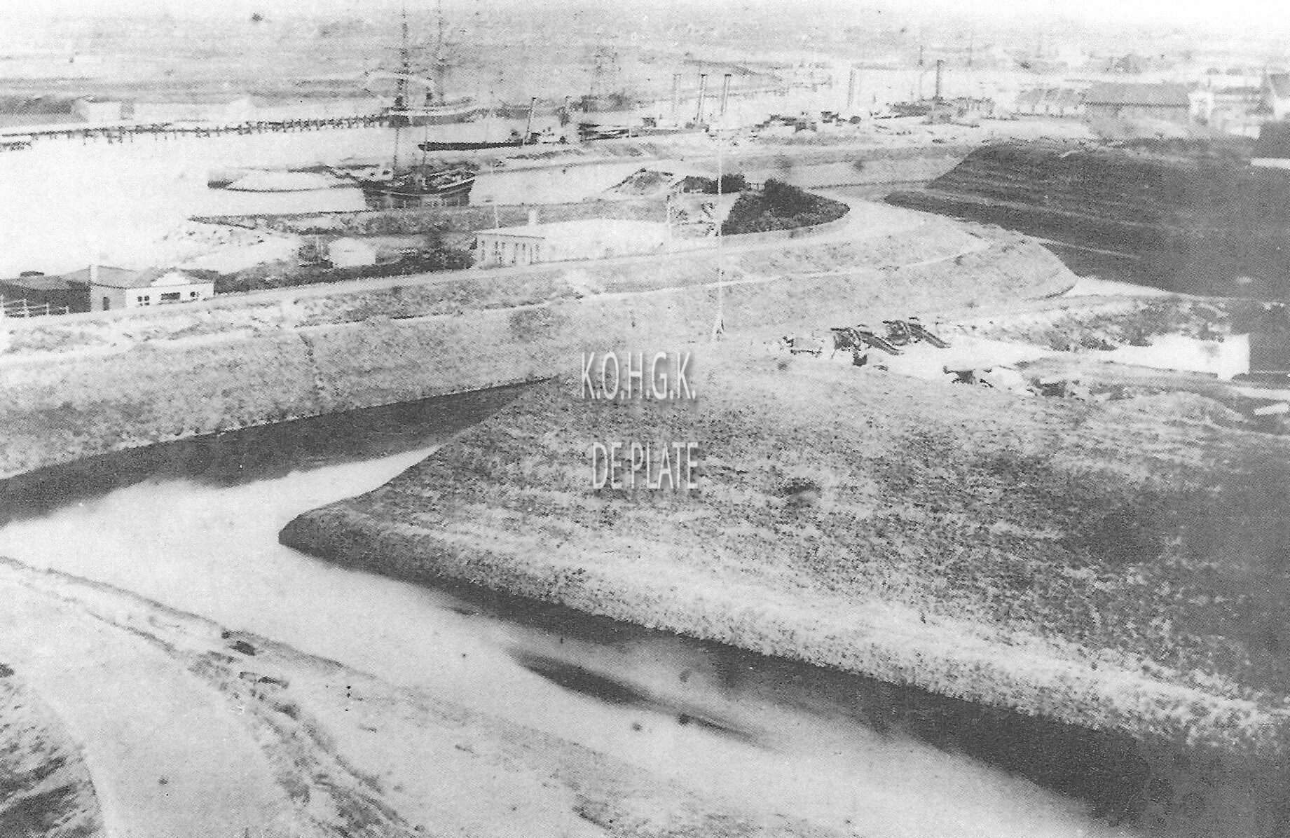 Zicht van de oostelijke vestingen, met rechts van de gracht het "Bastion" met kanonnen en links ervan de dijk. Achter de dijk ligt de oesterput van Musin. Het gebouw met plat dak, centraal. Een zeilschip ligt op de kuisbank. Langs de Quai aux Bateaux à Vapeur, de landtong naast de kuisbank, liggen enkele kleine pakketboten gemeerd