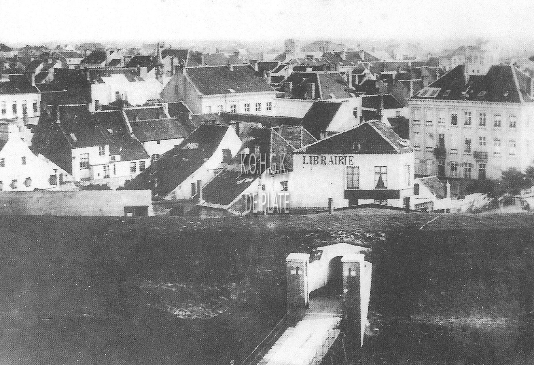 Foto genomen van op het dak van de "Cercle du Phare". Op de voorgrond het "Hulppoortje" , ook "Ulepoortje" genaamd, met het bruge dat de verbinding vormde tussen dijk en strand. Het groot gebouw rechts, was gelegen in de Kapucijnenstraat. De "Librairie" was deze van Godtfurneau.