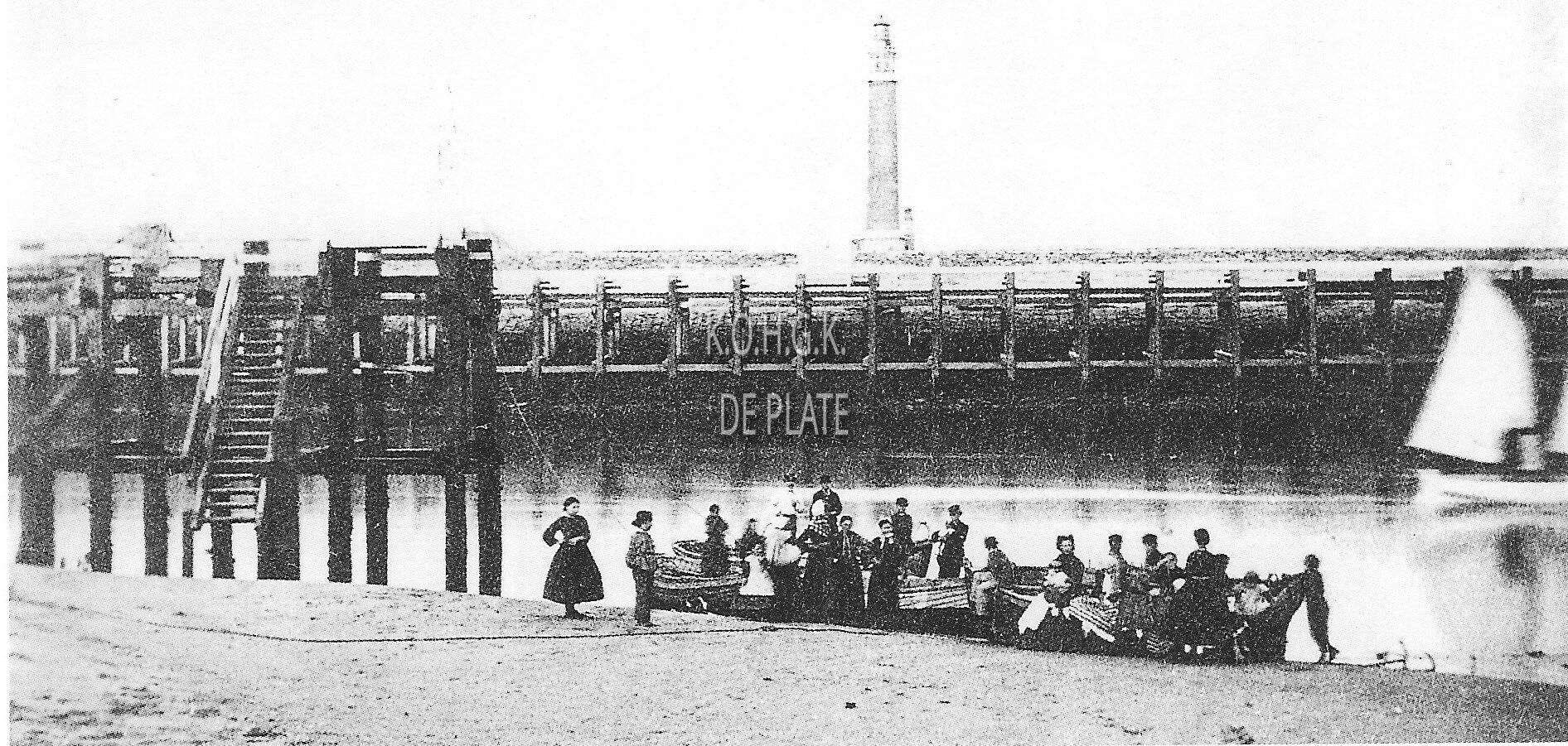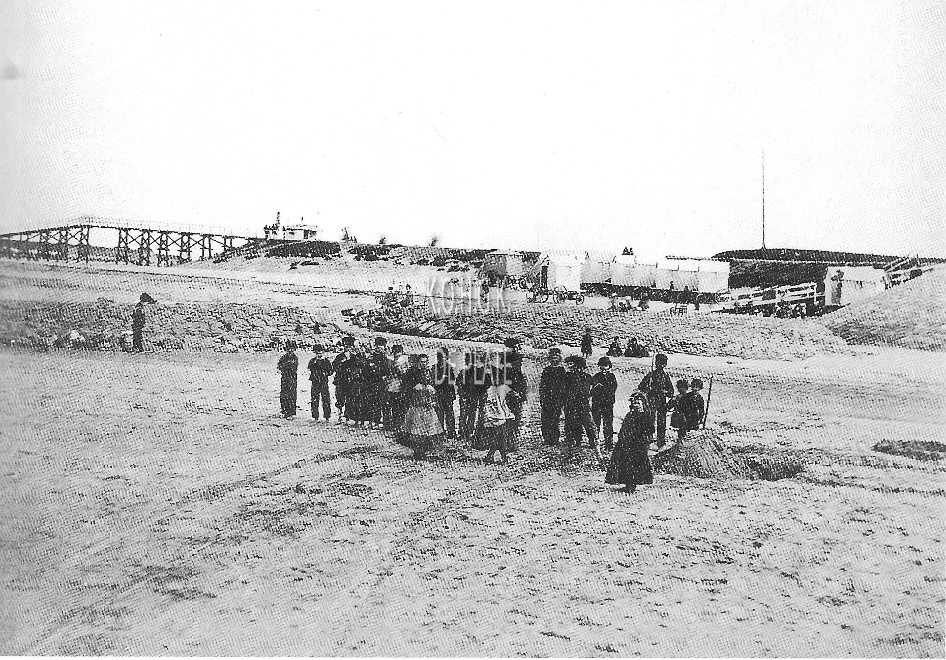Een groep kinderen op het Klein Strand. Links, de voetgangersbrug, bijgenaamd de "Jeneverbrug", die de dijk verbond met het Weststaketsel. Het paviljoentje op de dijk bij deze brug is het "Pavillon Geruzet" (Photographie - Salon de Lecture - Souvenirs). Rechts, op de achtergrond, een gedeelte van het "Bastion" van de oostelijke vestingen