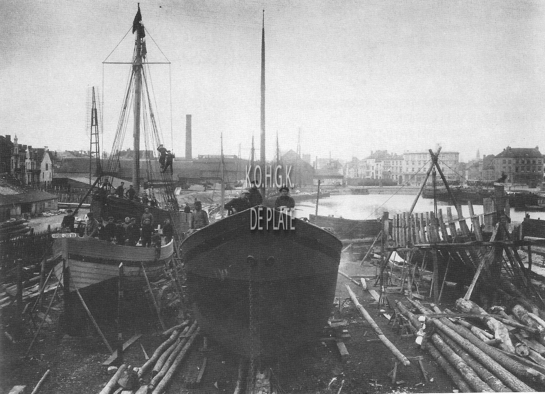 De Kuisbank, waar de schepen bij laag water aanlegden voor een onderhoudsbeurt van de scheepsromp. Gelegen tussen de "Quai aux Bateaux à Vapeur" (links) en de "Oostdijk" (rechts). Centraal op de foto en links van de mast van de vissersboot, ziet men het "Hope Hotel", gelegen aan de oude Visserskaai. Rechts van de mast, de achterzijde van het "Hôtel Maison Blanche"