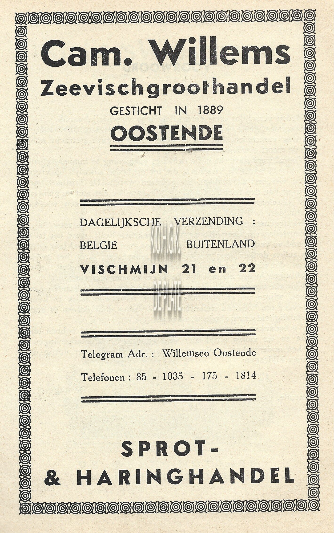 Advertentie : Cam. Willems. Zeevischgroothandel. Vischmijn 21 en 22 Oostende