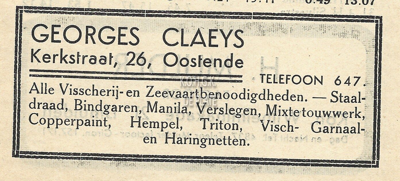 Advertentie : Georges Claeys. [Scheepsuitrustingen]. Kerkstraat 26 Oostende