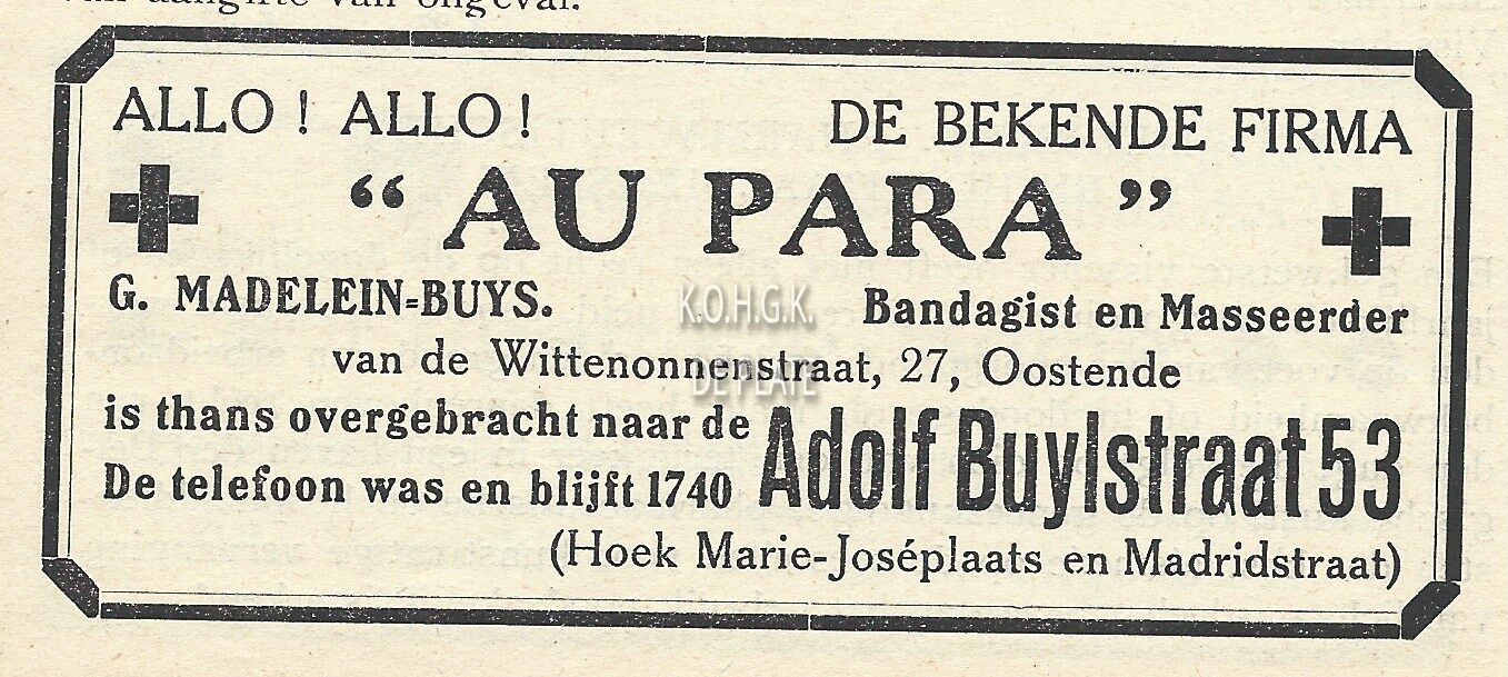 G. Madelein-Buys. Bandagist en Masseerder. Van de Wittenonnenstraat, 27, Oostende is thans overgebracht naar de Adolf Buylstraat 53 (Hoek Marie-Joséplaats en Madridstraat)