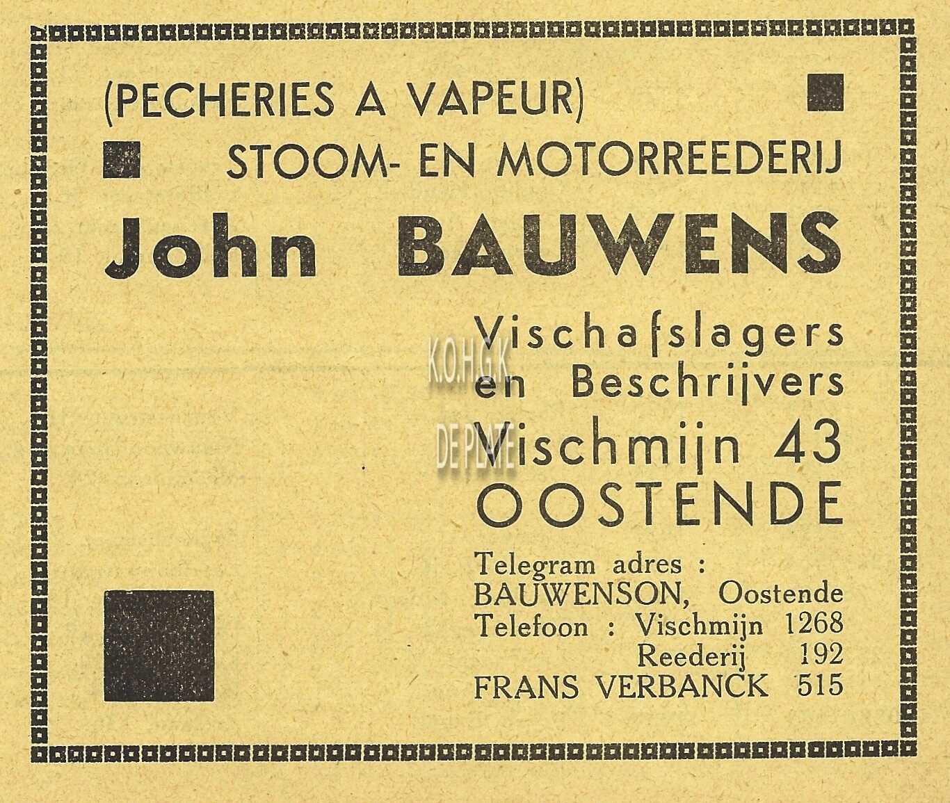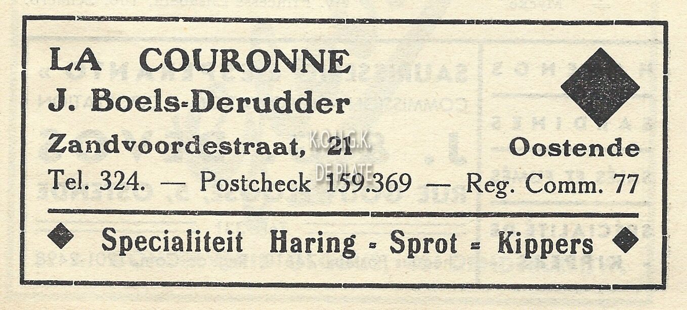 Fa Jan David. Vischmijn 12, Oostende. Groothandel in alle soorten versche visch. In- en uitvoer. Sprot- en haringhandel. Privaat : L. Gekiere, Prinsenlaan, Oostende