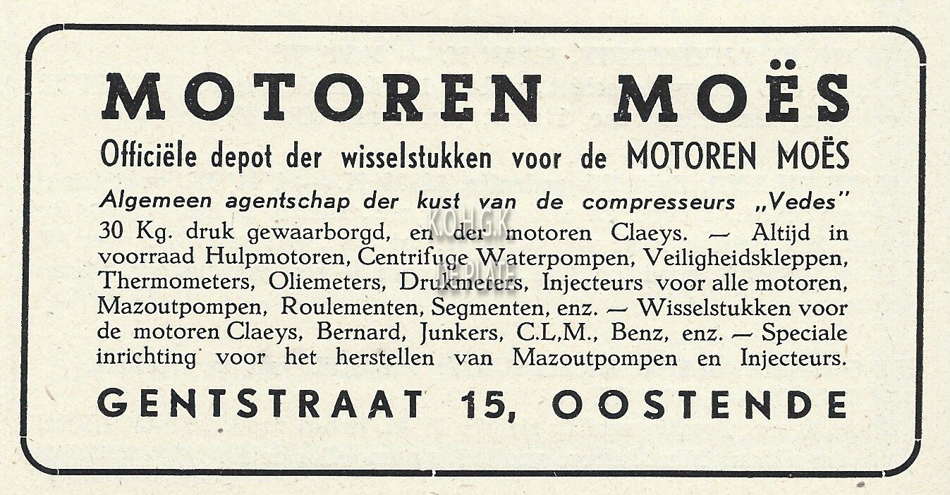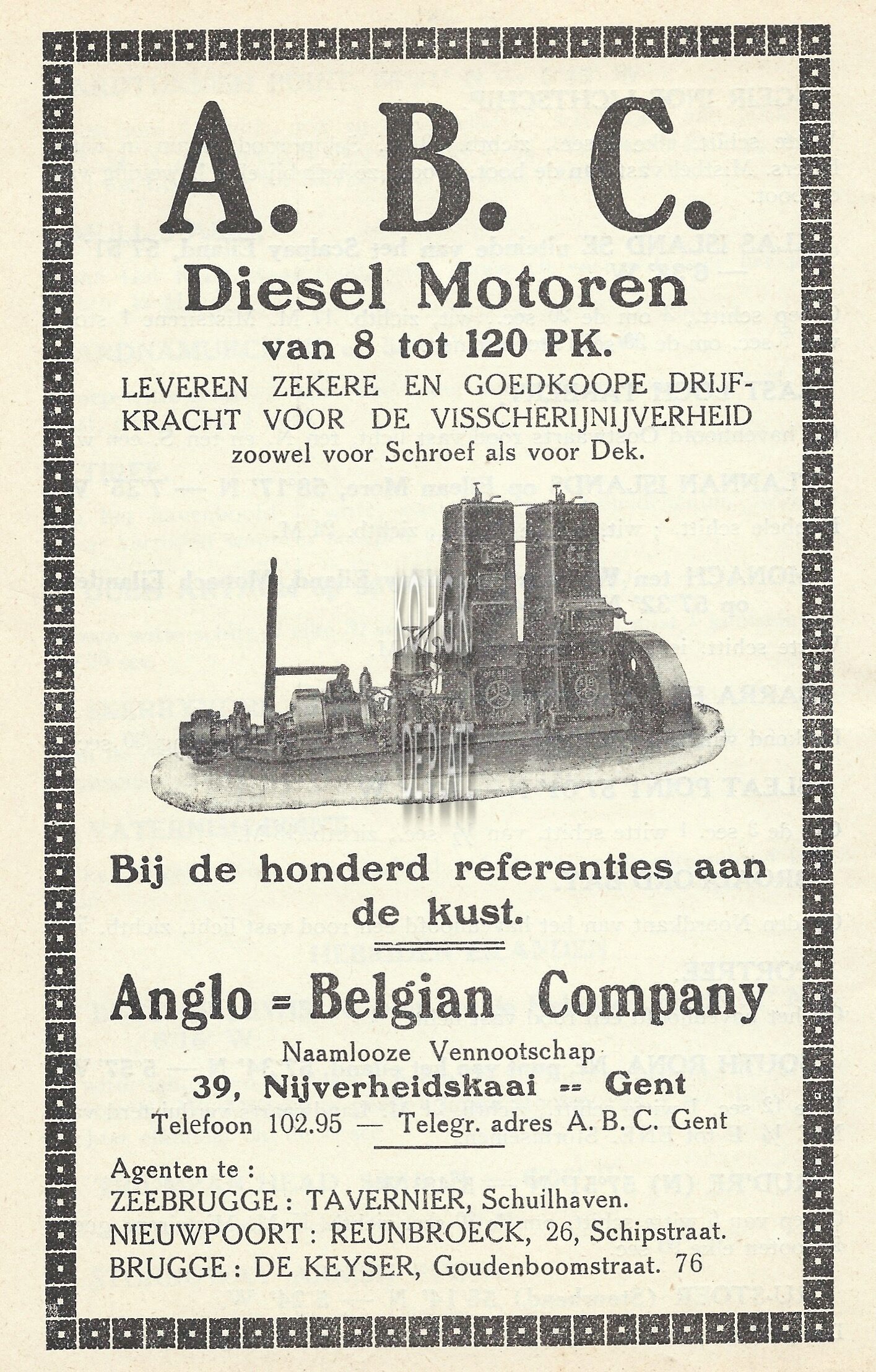 ABC Diesel Motoren van 8 tot 120 PK. Leveren zekere en goedkoope drijfkracht voor de visscherijnijverheid zoowel voor schroef als voor dek. Bij de honderd referenties aan de kust. Anglo Belgian Company. Naamlooze Vennootschap. 39, Nijverheidskaai Gent. Agenten te : Zeebrugge : Tavernier, Schuilhaven. Nieuwpoort : Reunbroeck, 26, Schipstraat. Brugge : De Keyser, Goudenboomstraat 76
