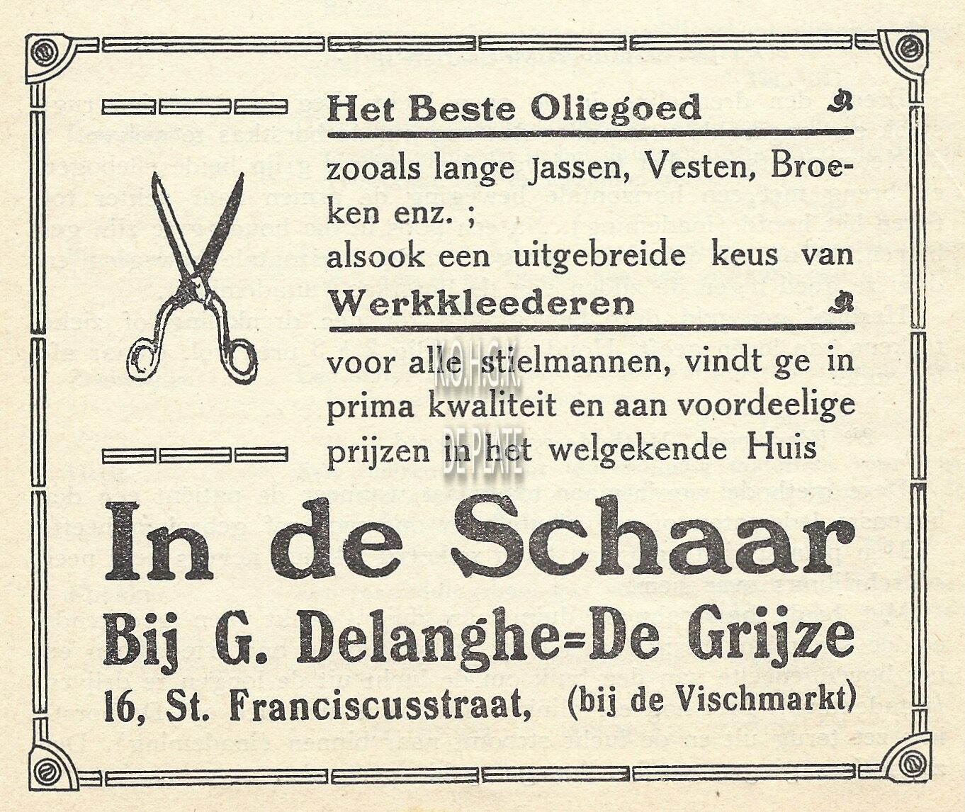 Het beste oliegoed zooals lange jassen, vesten, broeken enz. alsook een uitgebreide keus van werkkleederen voor alle stiemannen, vindt ge in prima kwaliteit in het welgekende huis In de Schaar bij G. Delanghe-De Grijze. 16, St. Franciscustraat 16 (bij de vischmarkt)