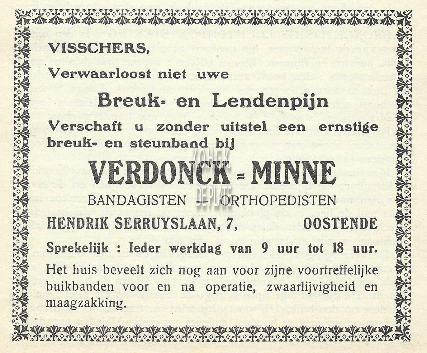 Visschers, verwaarloost niet uwe breuk- en lendenpijn. Verschaft u zonder uitstel een ernstige breuk- en steunband bij Verdonck-Minne, bandagisten - orthopedisten. Hendrik Serruyslaan 7 Oostende. Sprekelijk : Ieder werkdag van 9 uur tot 18 uur. Het huis beveelt zich nog aan voor zijne voortreffelijke buikbanden voor en na operatie, zwaarlijvigheid en maagzakking.