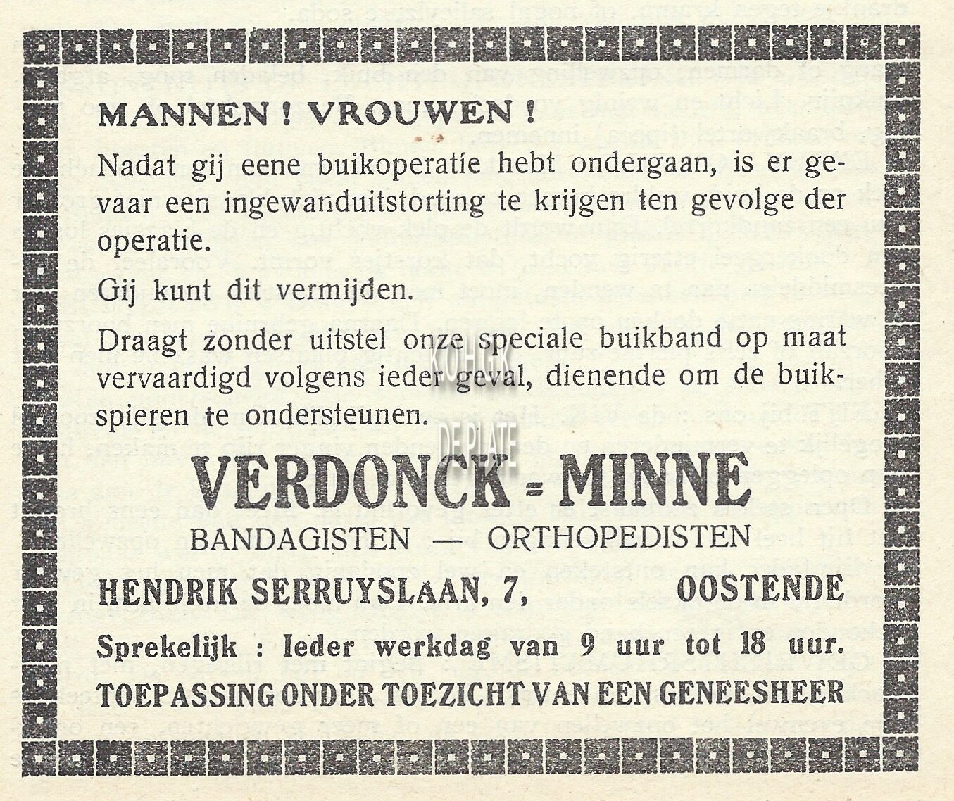 Mannen ! Vrouwen !. Nadat gij eene buikoperatie hebt ondergaan, is er gevaar een ingewandenuitstorting te krijgen ten gevolge der operatie. Gij kunt dit vermijden. Draagt zonder uitstel onze speciale buikband op maat vervaardigd volgens ieder geval, dienende om de buikspieren te ondersteunen. Verdonck-Minne. Bandagisten - Orthopedisten. Hendrik Serruyslaan 7, Oostende. Sprekelijk : Ieder werkdag van 9 uur tot 18 uur. Toepassing onder toezicht van een geneesheer