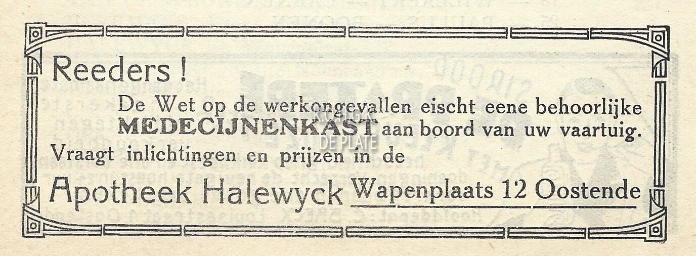 Reeders !. De wet op de werkongevallen eischt eene behoorlijke medecijnenkast aan boord van uw vaartuig. Vraagt inlichtingen en prijzen in de Apotheek Halewyck, Wapenplaats 12 Oostende