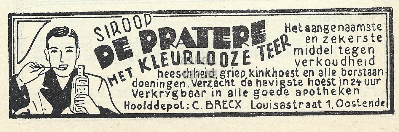 Siroop De Pratere met kleurlooze teer. Het aangenaamste en zekerste middel tegen verkoudheid, heeschheid, griep, kinkhoest en alle borstaandoeningen. Verzacht de hevigste hoest in 24 uur. Verkrygbaar in alle goede apotheken. Hoofddepot : C. Brecx, Louisastraat 1, Oostende