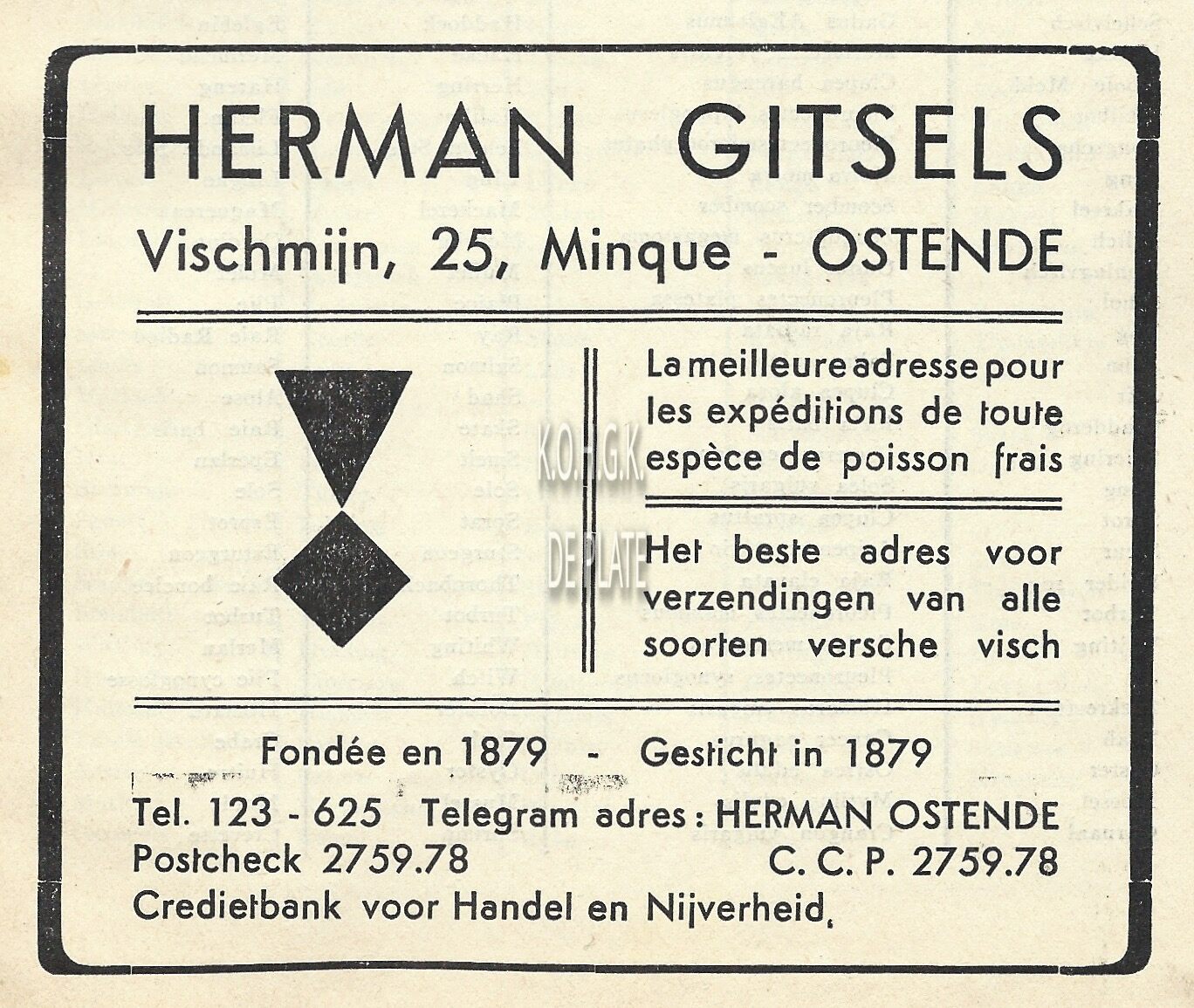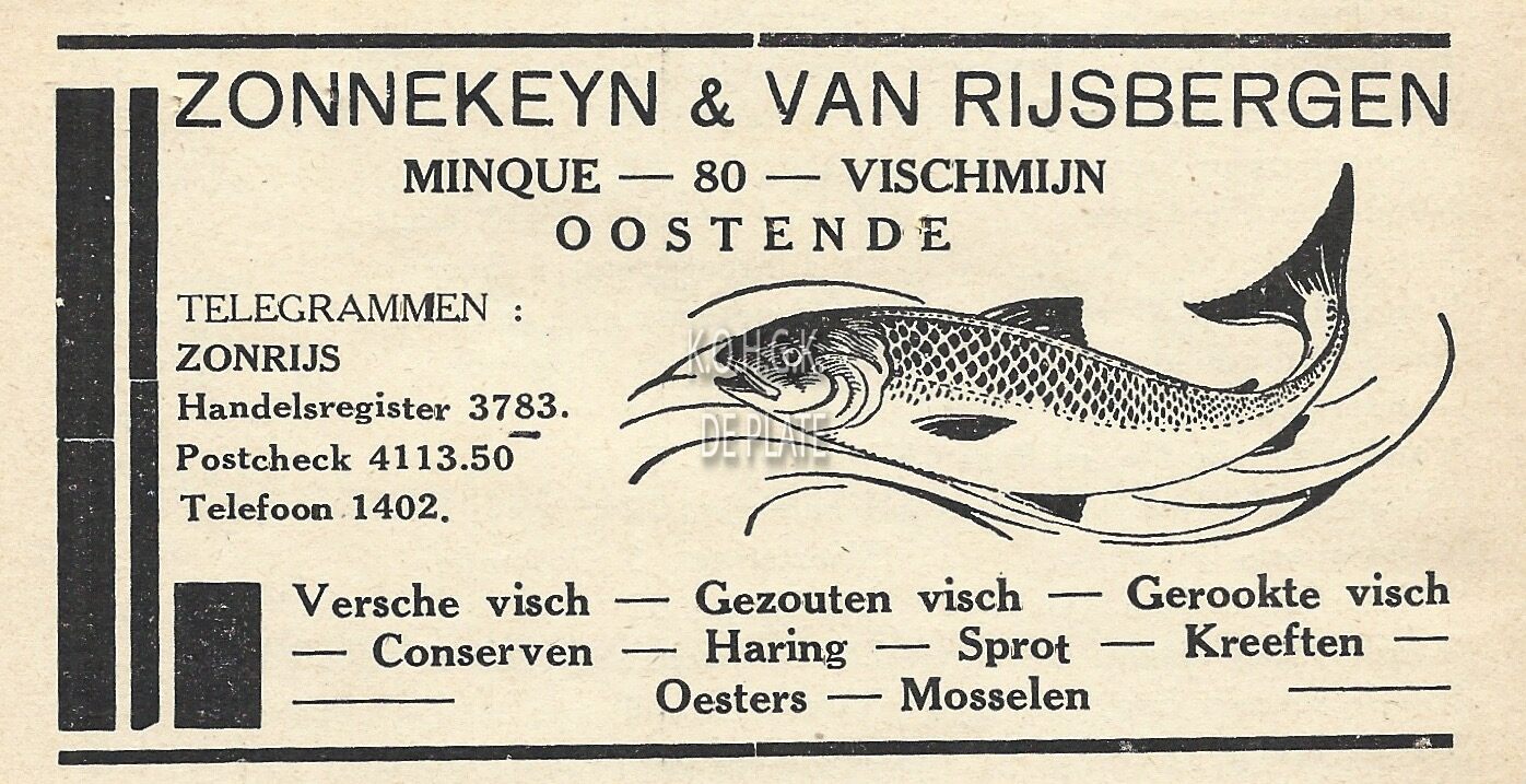 La meilleure adresse pour les expéditions de tout espèce de poisson frais. Het beste adres voor verzendingen van alle soorten versche visch. Fondée en 1879. Gesticht in 1879