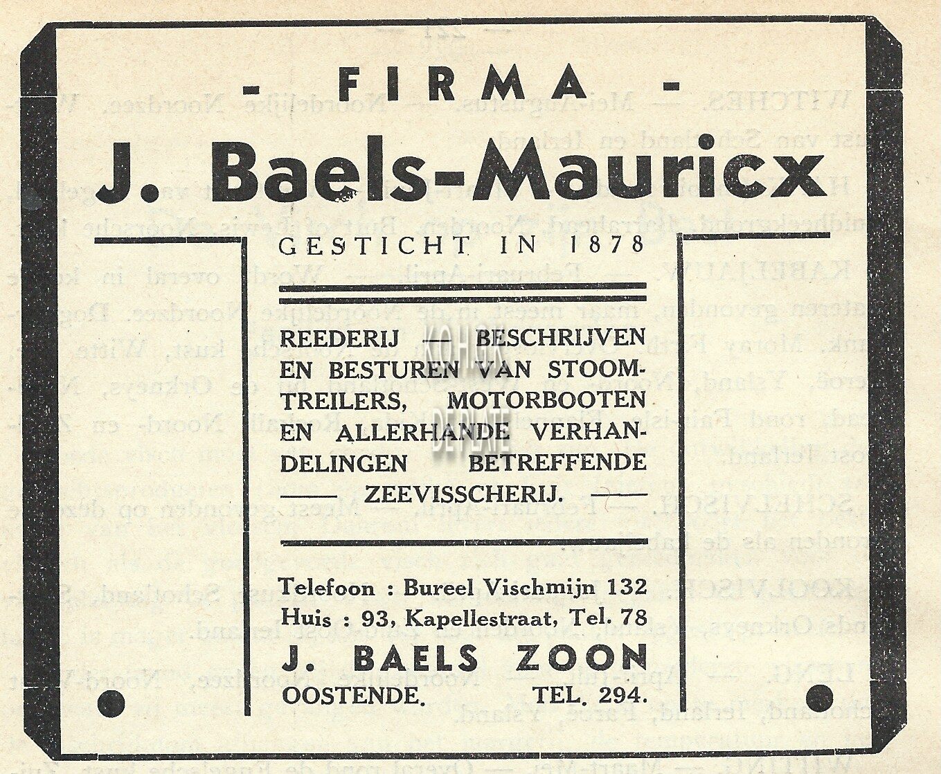 Gesticht in 1878. Reederij, bechrijven en besturen van stoomtreilers, motorbooten en allerhande verhandelingen betreffende zeevisscherij. Telefoon : bureel Vischmijn 132. Huis : 93, Kapellestraat. J. Baels Zoon Oostende