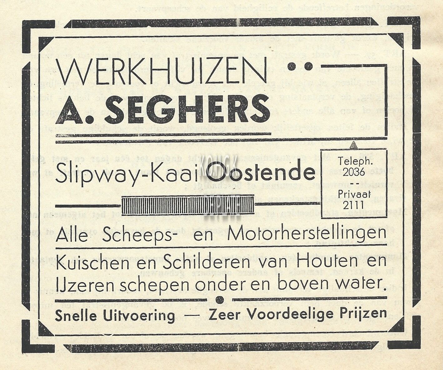 Advertentie : Werkhuizen A. Seghers. Slipwaykaai, Oostende