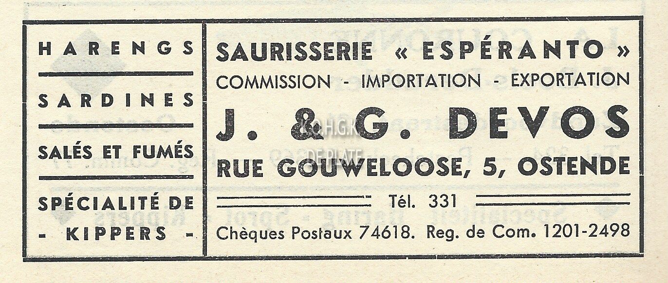 Advertentie : Saurisserie "Espéranto". J. en G. Devos. Gouwelozestraat 5, Oostende