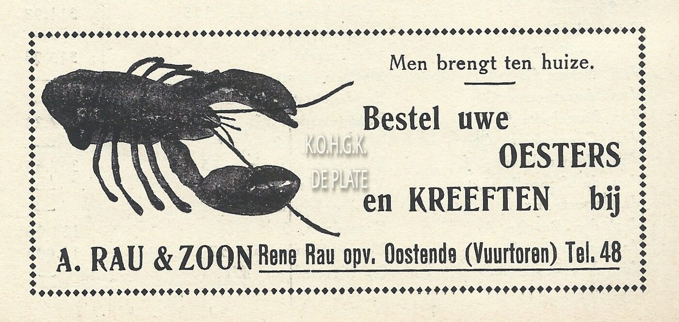 Men brengt ten huize. Bestel uwe oesters en kreeften bij A. Rau & Zoon. Rene Rau opv. Oostende (Vuurtoren) tel.48