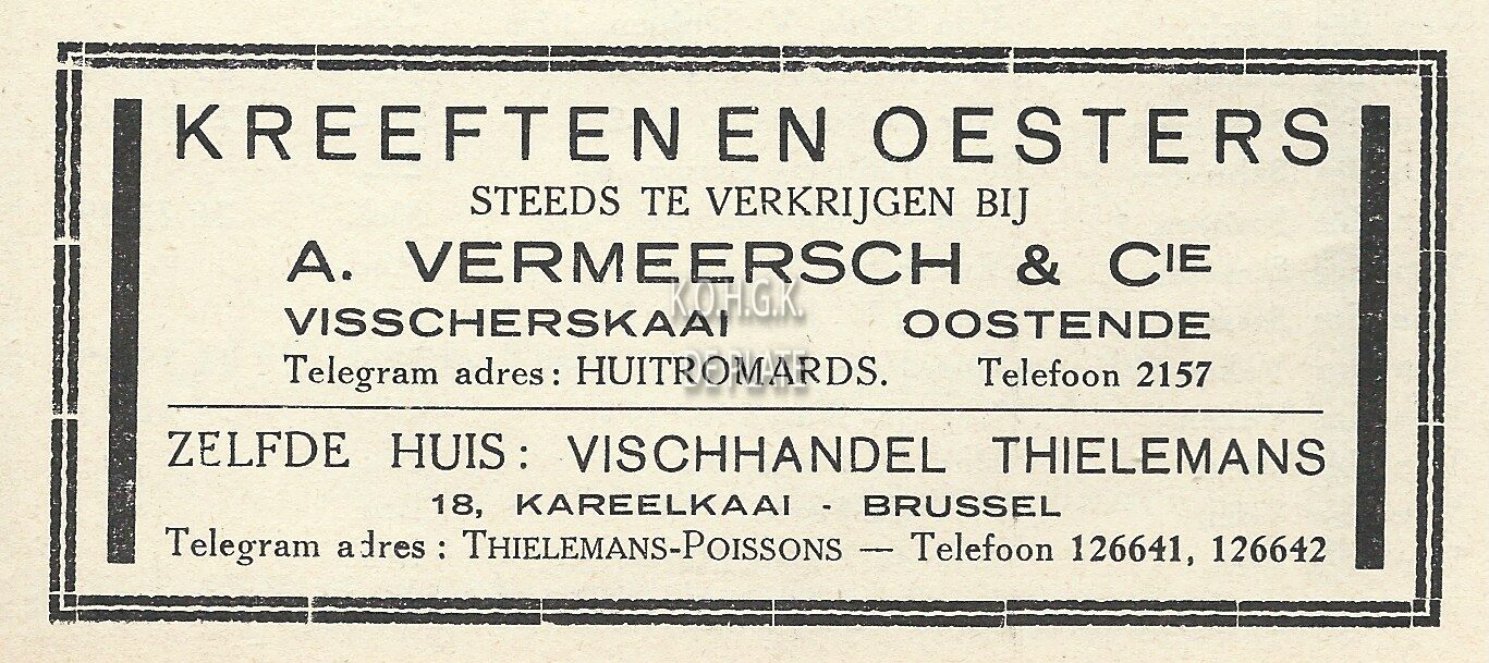 Kreeften en oesters steeds te verkrijgen bij A. Vermeersch & Cie. Visscherskaai, Oostende. Zelfde huis : Vischhandel Thielemans. 18, Kareelkaai, Brussel