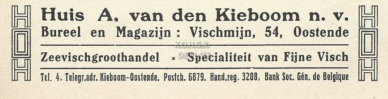 Advertentie : Huis A. van den Kieboom. Zeevisgroothandel. Vismijn 54, Oostende