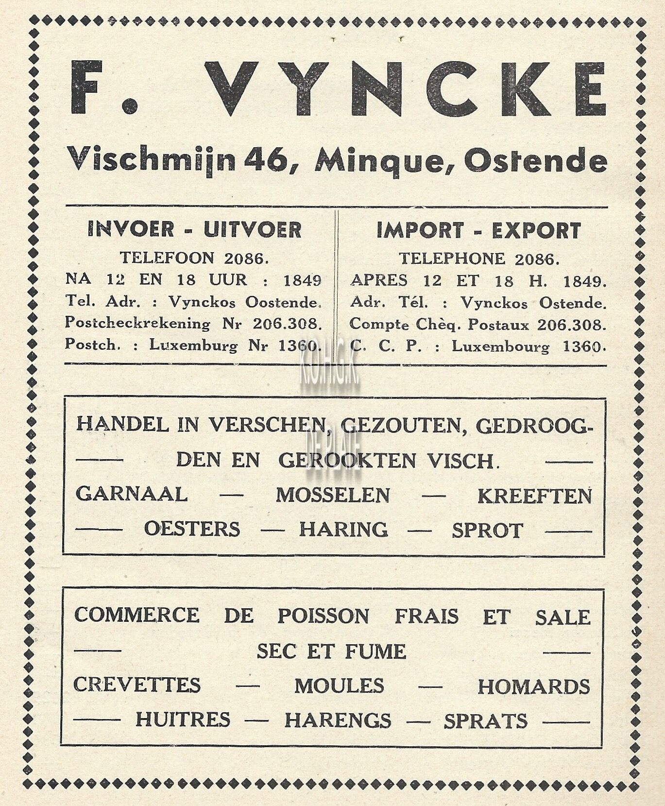 Bureel en magazijn : Vischmijn 54, Oostende. Zeevischgroothandel. Specialiteit van fijne visch.