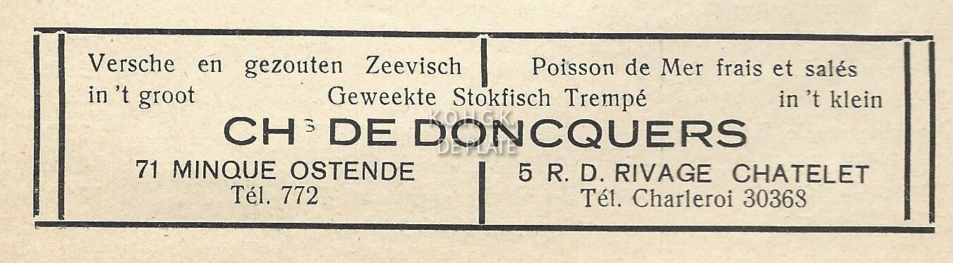 Advertentie : Ch. De Doncquers. Vishandel. Vismijn 71, Oostende