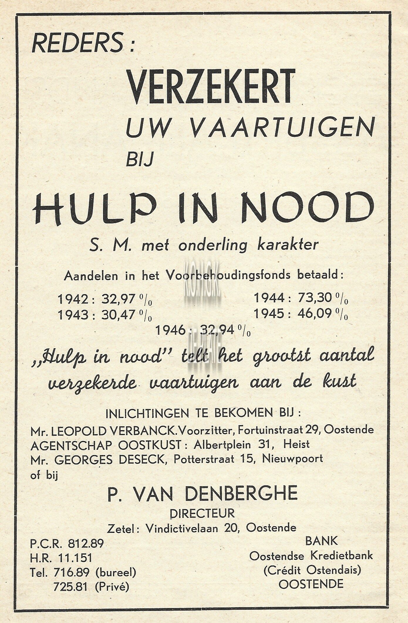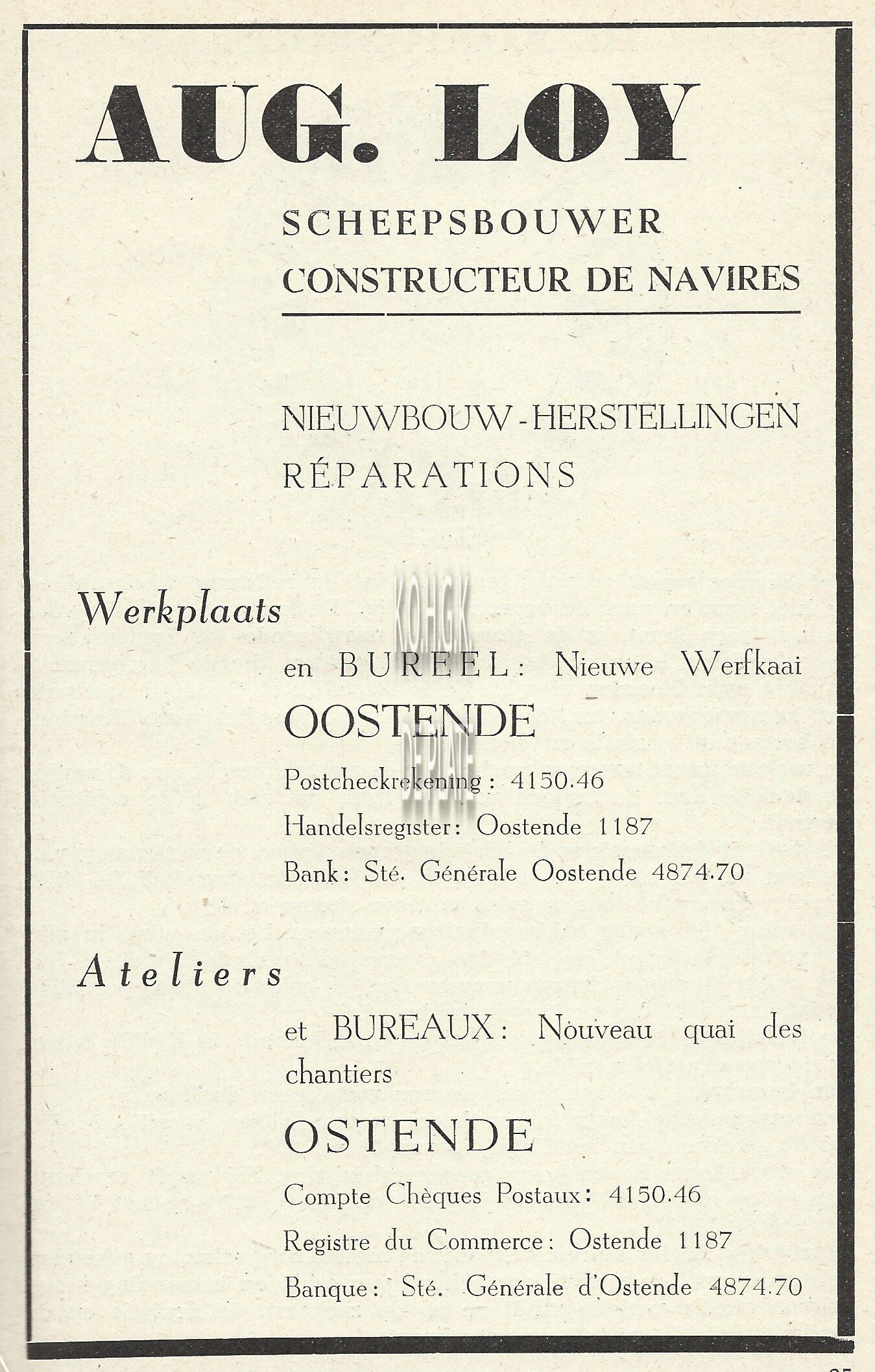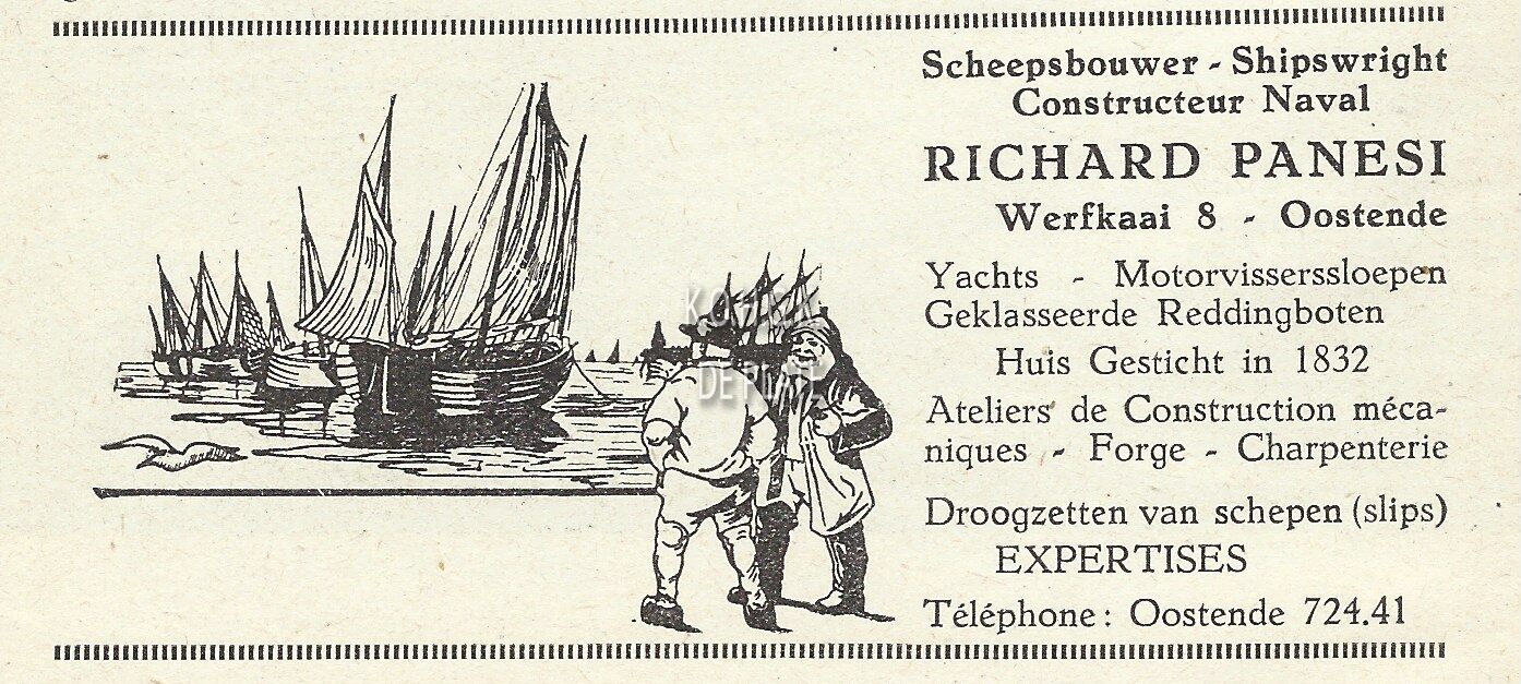 Ateliers de Réparations & Chantiers. Antwerpen. Le Havre. Oostende. Duinkerke. Levert tegen uiterst lage prijzen alle motortrawlers, visscherssloepen, tuibooten, binnenschepen, enz. Beschikt over moderne en volledige werkhuizen voor ketelmakers, paswerkers, draaiers, smeden, timmerlieden, schilders, ijzer- en bronsgieters, electrisch en autogeen lasschers. Belast zich met alle herstellingswerken. Droogdok en hellingswerken. Bijhuis : Bij de Slipway