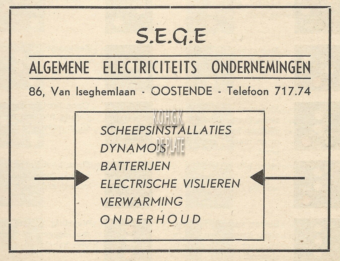 Advertentie : SEGE. Algemene Electriciteits Ondernemingen. Van Iseghemlaan 86, Oostende