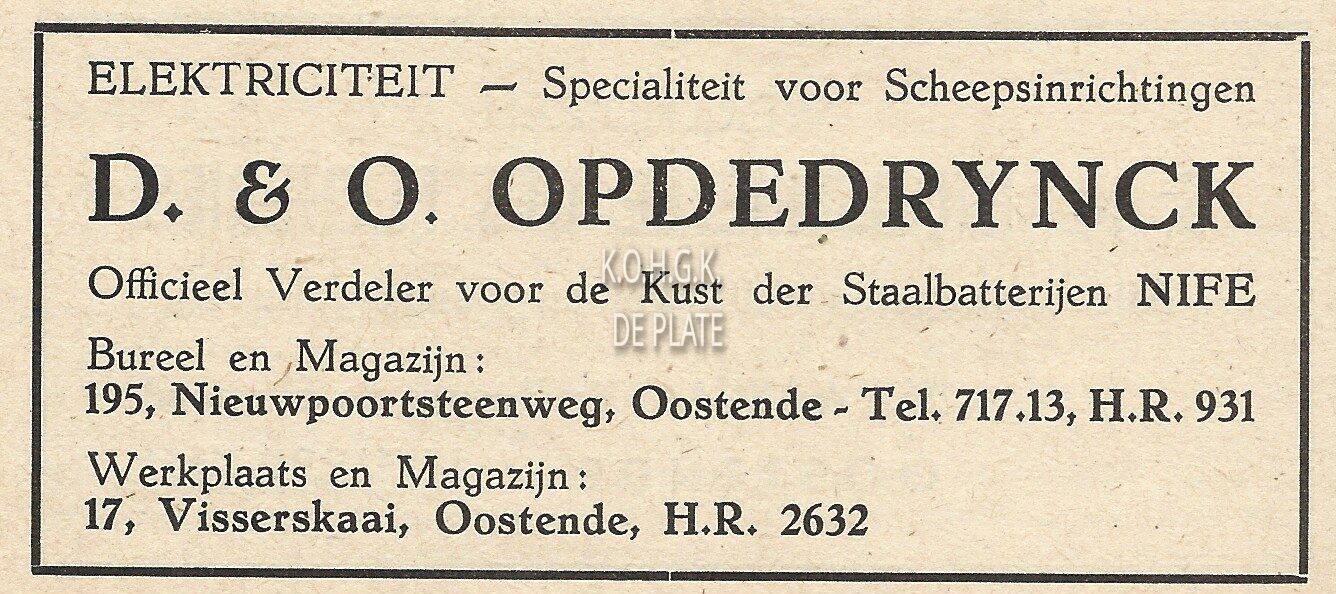 Elektriciteit - Specialiteit voor scheepsinrichtingen. D. & O. Opdedrynck. Officieel verdeler voor de kust der staalbatterijen NIFE. Bureel en magazijn : 19, Nieuwpoortsteenweg, Oostende. Werkplaats en magazijn : 17, Visserskaai, Oostende.