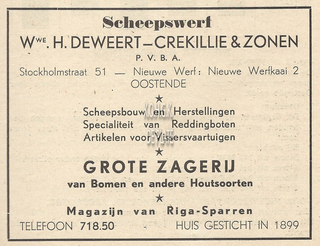 Scheepswerf Wwe. H. Deweert-Crekillie & Zonen pvba. Stockholmstraat 51 - Nieuwe Werf : Nieuwe Werfkaai 2, Oostende. Scheepsbouw en herstellingen. Specialiteit van reddingboten. Artikelen voor vissersvaartuigen. Grote zagerij van bomen en andere houtsoorten. Magazijn van Riga-sparren. Huis gesticht in 1899.