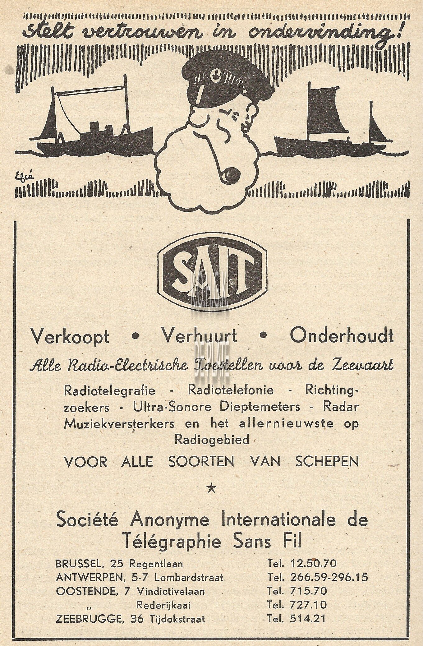 Stelt vertrouwen in ondervinding !. SAIT. Verkoopt. Verhuurt. Onderhoudt. Alle radio-electrische toestellen voor de zeevaart. Radiotelegrafie. Radiotelefonie. Richtingzoekers. Ultra-sonore dieptemeters. Radar. Muziekversterkers en het allernieuwste op radiogebied. Voor alle soorten van schepen. Société Anonyme Internationale de Télégraphie Sans Fil. Brussel, 25 Regentlaan. Antwerpen, 5-7 Lombardstraat. Oostende, 7 Vindictivelaan, Rederijkaai. Zeebrugge, 36 Tijdokstraat.