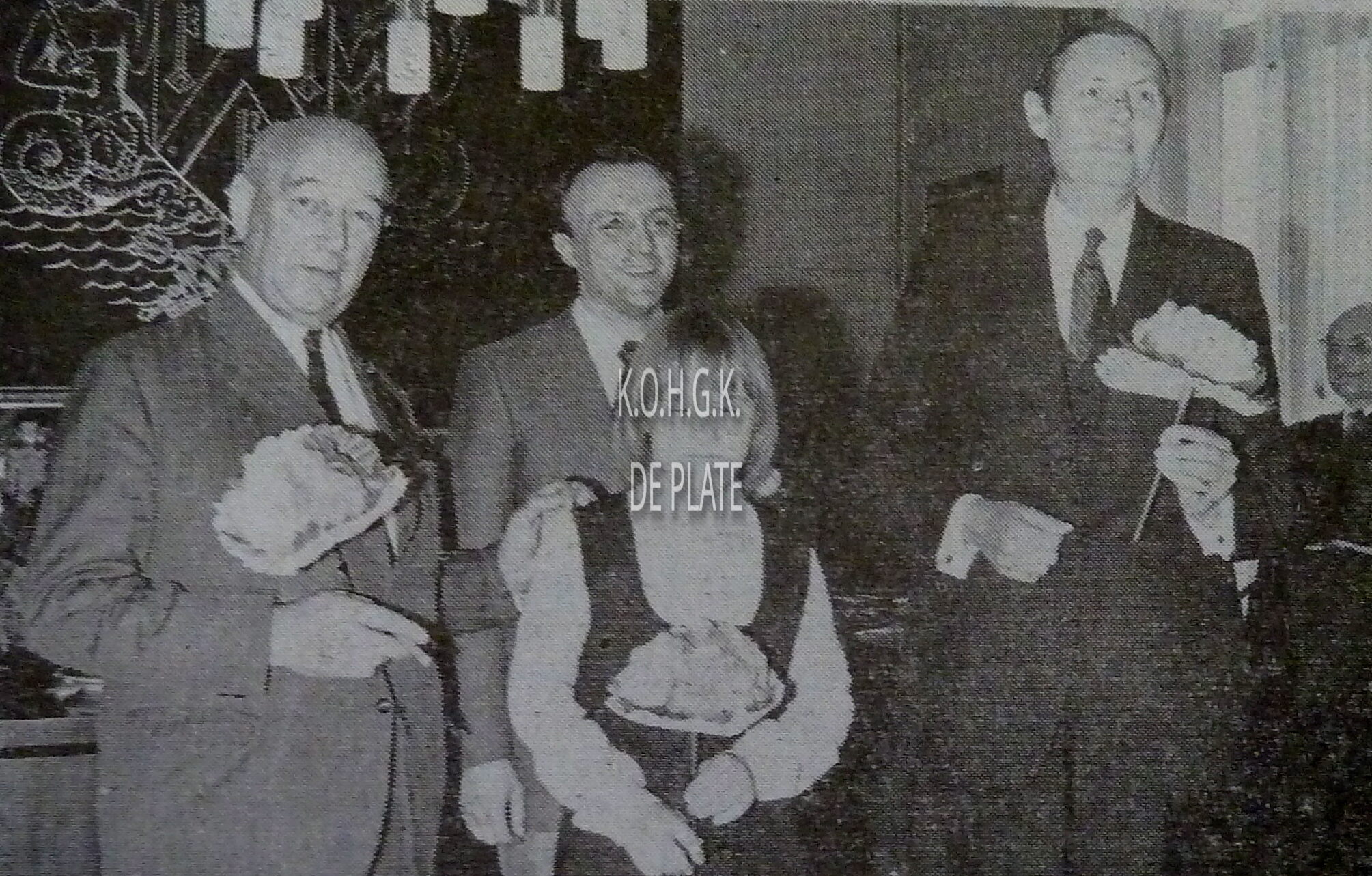 Foto : De heemkundige kring De Plate viert hun voorzitter en stichter Ernest De Taye. Omer Vilain, stadsbibliothecaris en secretaris van de kring overhandigt een geschenk aan de voorzitter en zijn echtgenote. Op de foto o.a. : Gilbert Vermeersch en schepen Raymond Miroir.