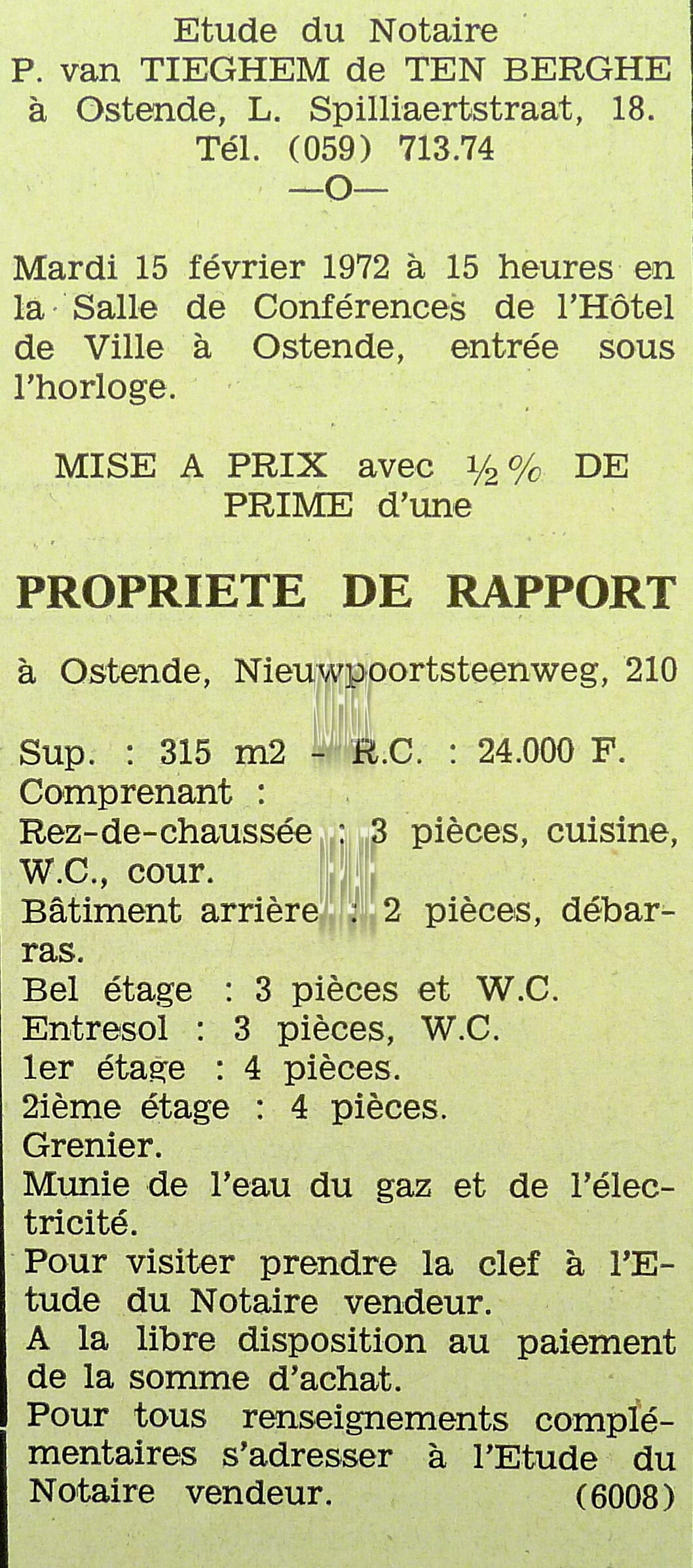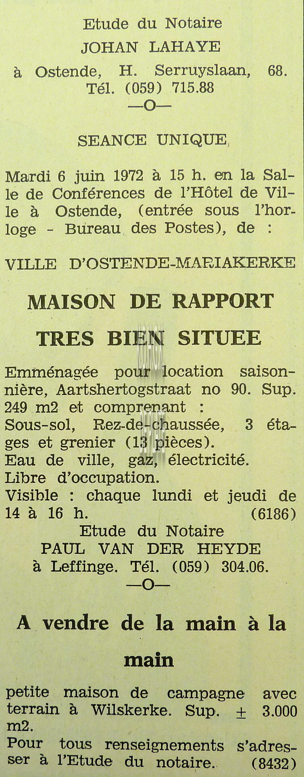 Advertentie : Etude du notaire J. Lahaye. Vente publique. I : Appartement nouvellement construit. Type A, no. 132 au 18e étage de L"Europacentrum". Bd. Van Iseghemlaan. II : Belle parcelle de terrain à construire. Coin des Oogststraat et Slachtersstraat
