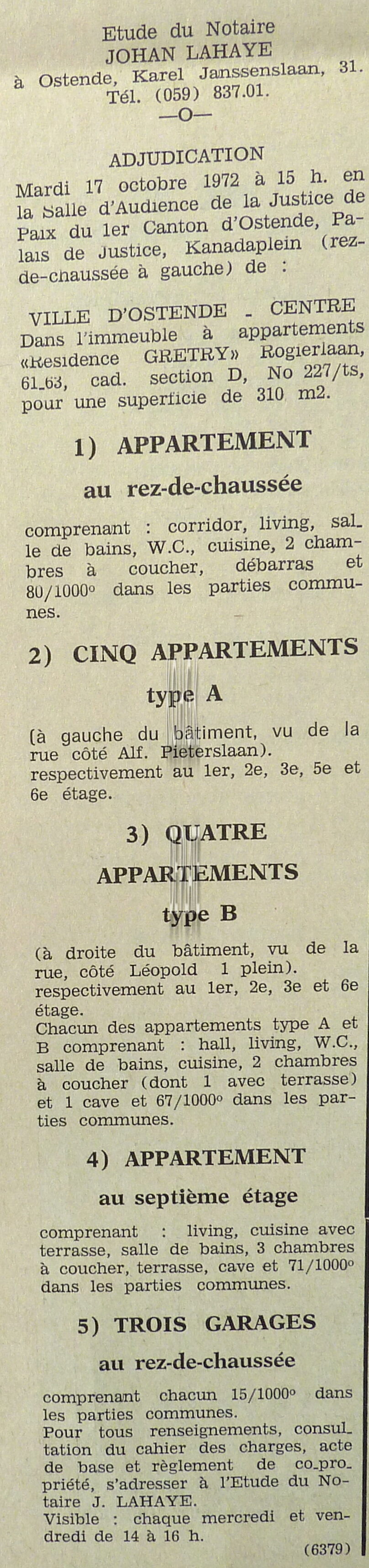 Advertentie : Etude du notaire J. Lahaye. Vente publique. Résidence Gretry. Rogierlaan 61-63. I : Appartement au rez-de-chaussée. II : 5 appartements type A. III : 4 appartements type B. IV : Appartement au 7ième étage. V : 3 garages au rez-de-chaussée