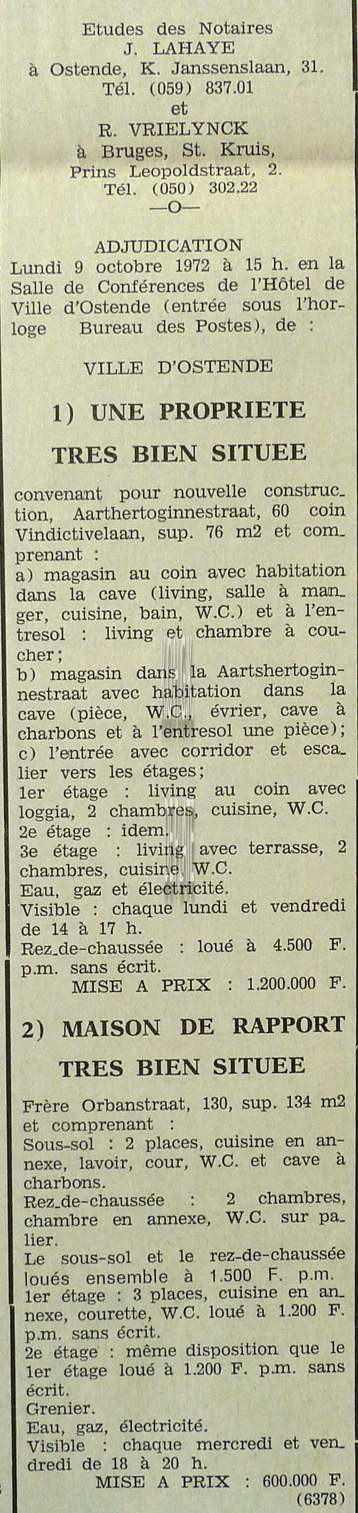 Advertentie : Etudes des notaires Johan Lahaye et R. Vrielynck. Vente publique. I : Une propriété très bien située. Aartshertoginnestraat 60. II : Maison de rapport. Frère-Orbanstraat 130