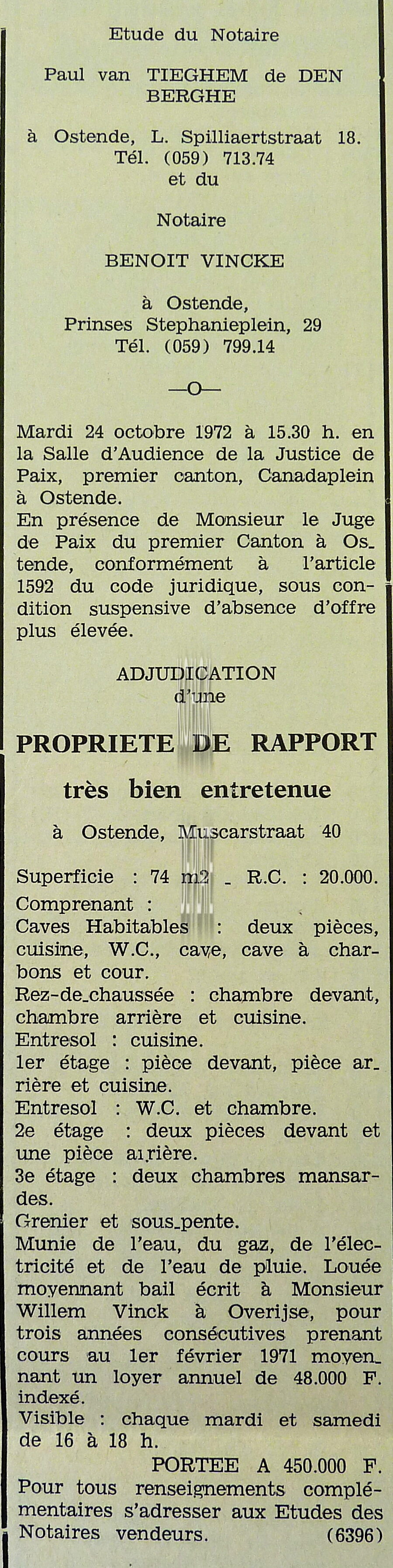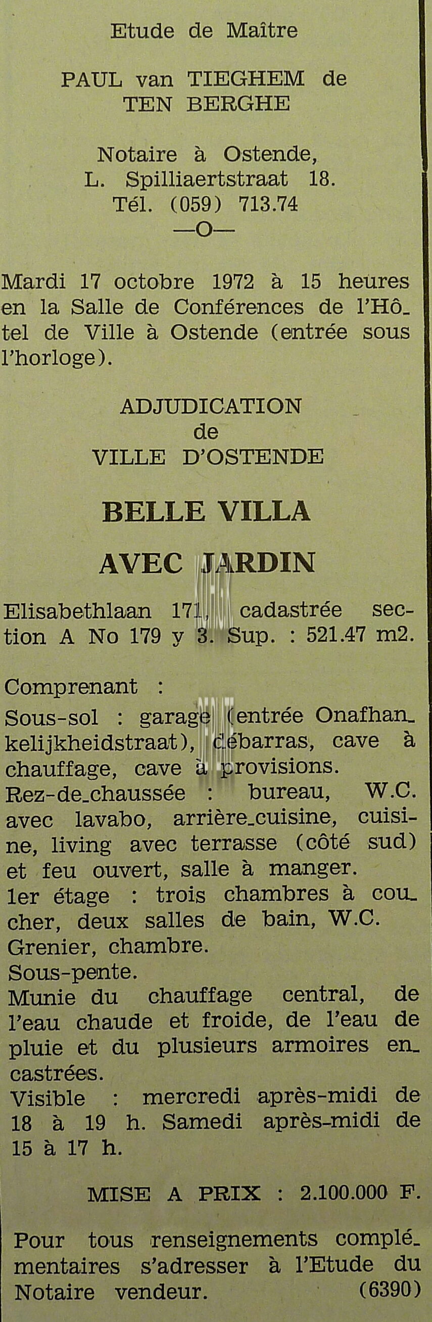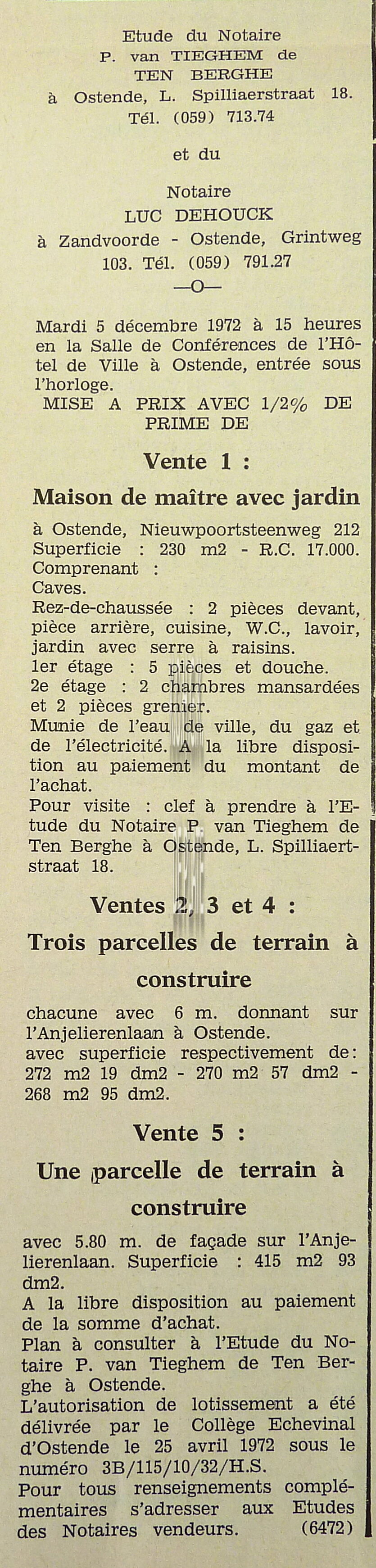 Advertentie : Etudes des notaires P. van Tieghem de Ten Berghe et Luc Dehouck. Vente publique. I : Maison de maître avec jardin. Nieuwpoortsesteenweg 212 ; II : 4 parcelles de terrain à construire donnant sur l'Anjelierenlaan.