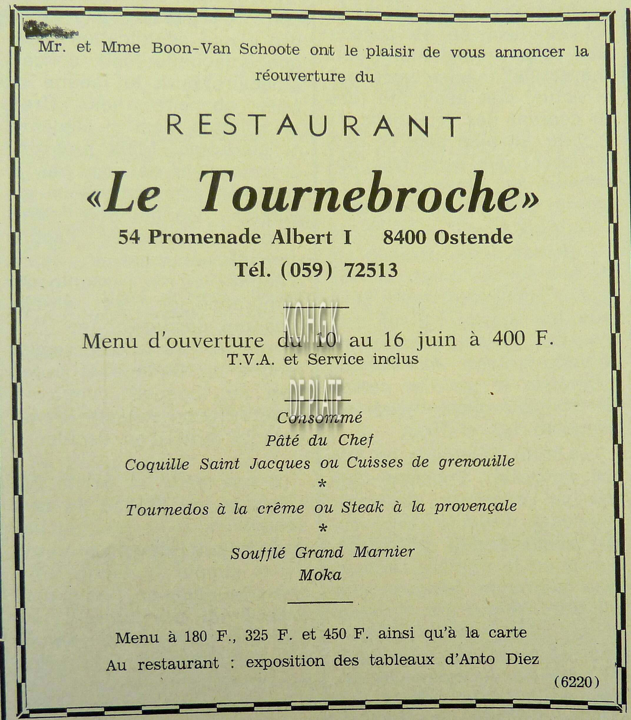 ADVERTENTIES ; HORECALE TOURNEBROCHE (RESTAURANT)ALBERT I PROMENADERESTAURANTSBOON-VAN SCHOOTE (RESTAURANTHOUDERS)MENU'S