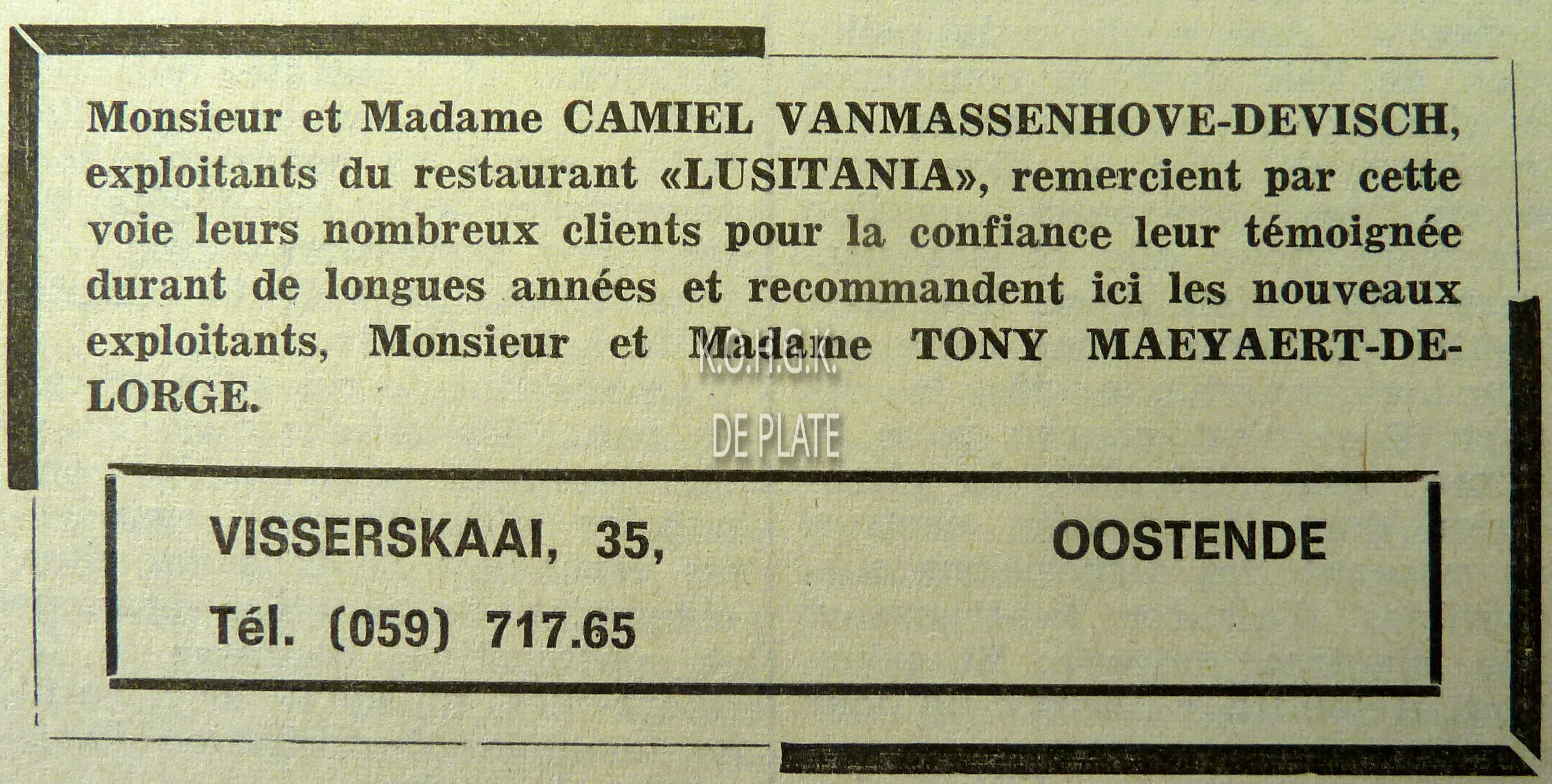 ADVERTENTIES ; HORECARESTAURANT LUSITANIAVANMASSENHOVE CAMIEL (RESTAURANTHOUDER)MAEYAERT-DELORGE TONY (RESTAURANTHOUDER GALERIJHOUDER)VISSERSKAAI