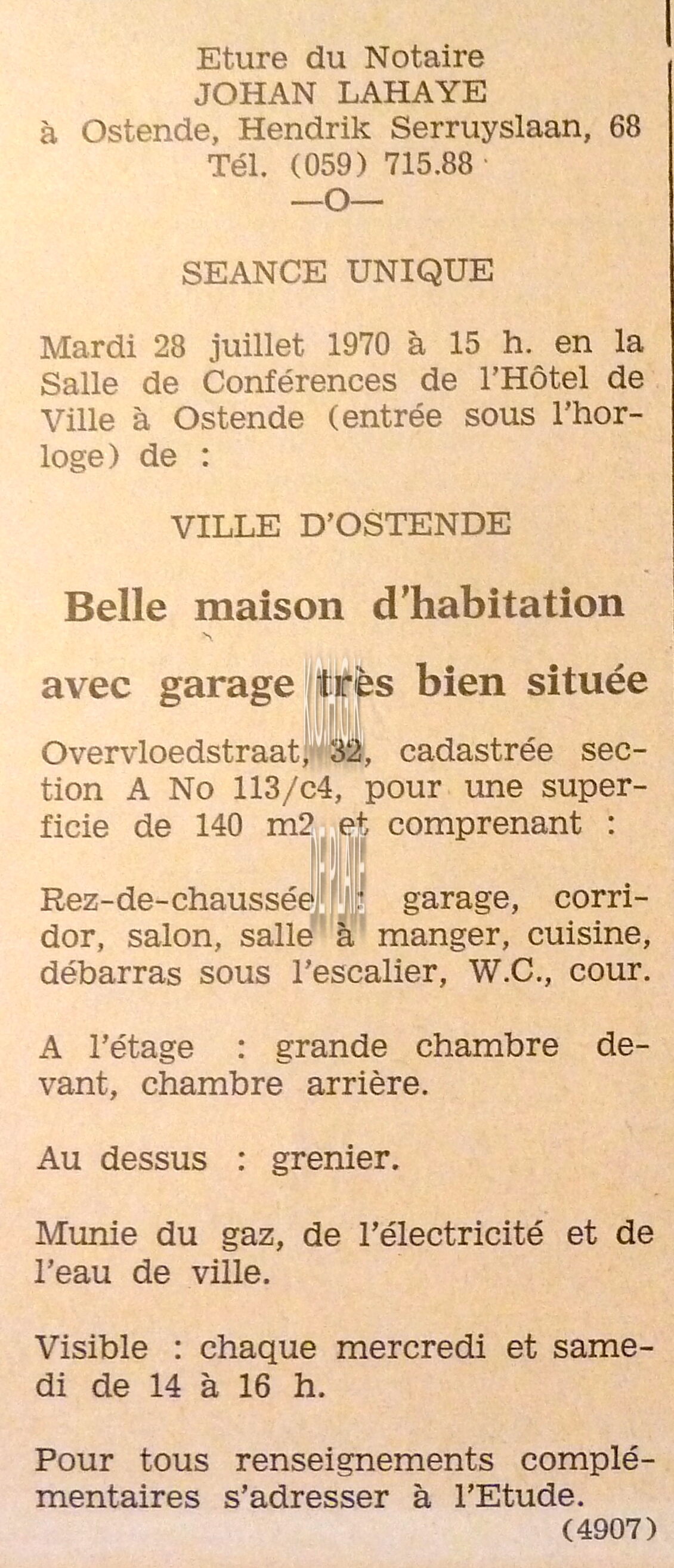 Advertentie : Etude du notaire F.J. Van Caillie. Vente publique. Lot 1 : Maison de commerce. "Pension Agnes" Christinastraat 41...