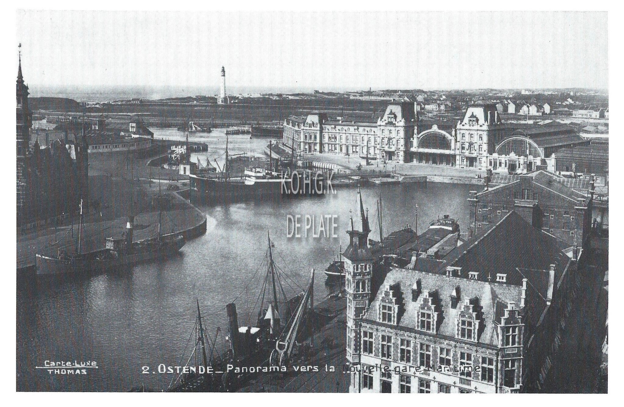 Carte Luxe Thomas. 2. Ostende - Panorama vers la nouvelle gare Maritime. "De datering lijkt mij niet juist. Op de achergrond de tweede vuurtoren, vernield door de Duitsers in 1915 en een onbeschadigd Zeestation. 1913-1914 lijkt mij juister" (Georges Van Duyvenboden)