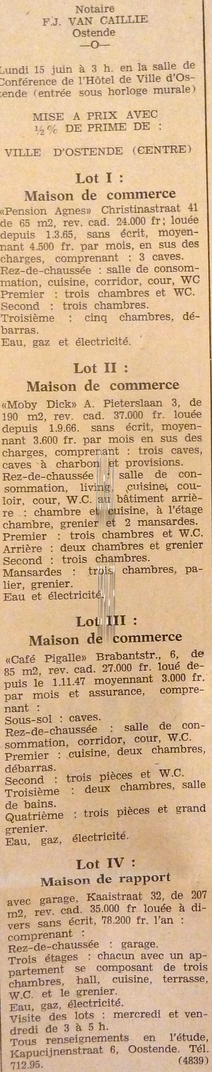 Advertentie : Etude du notaire F.J. Van Caillie. Vente publique. Lot 1 : Maison de commerce. "Pension Agnes" Christinastraat 41...