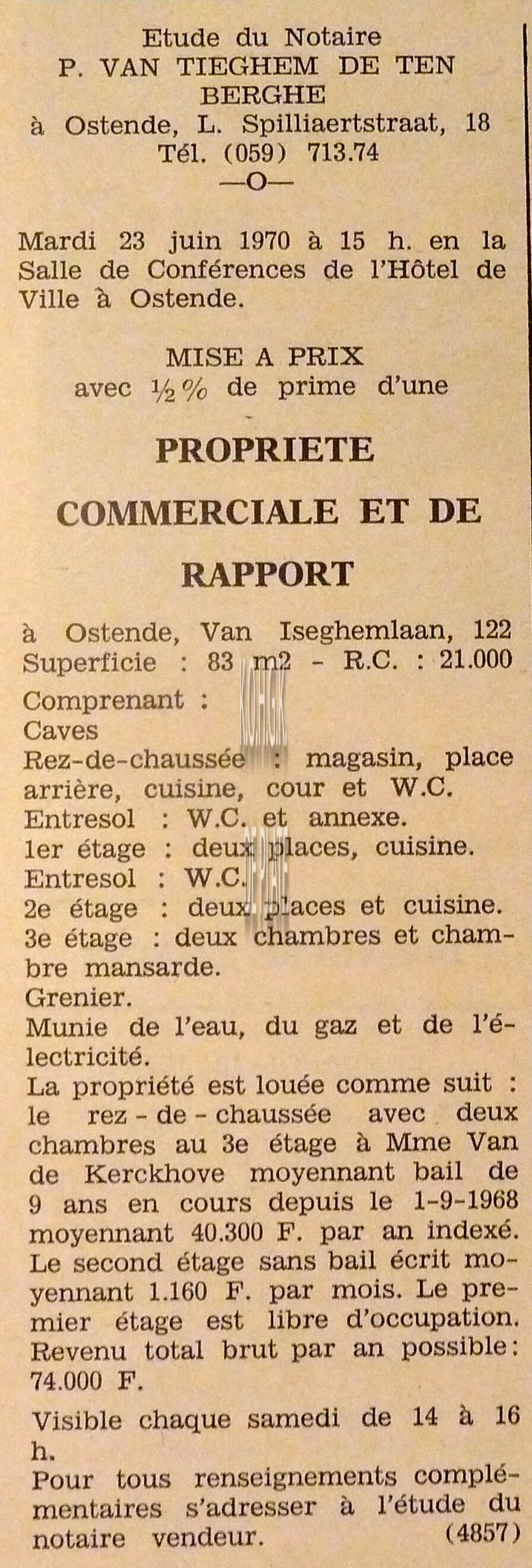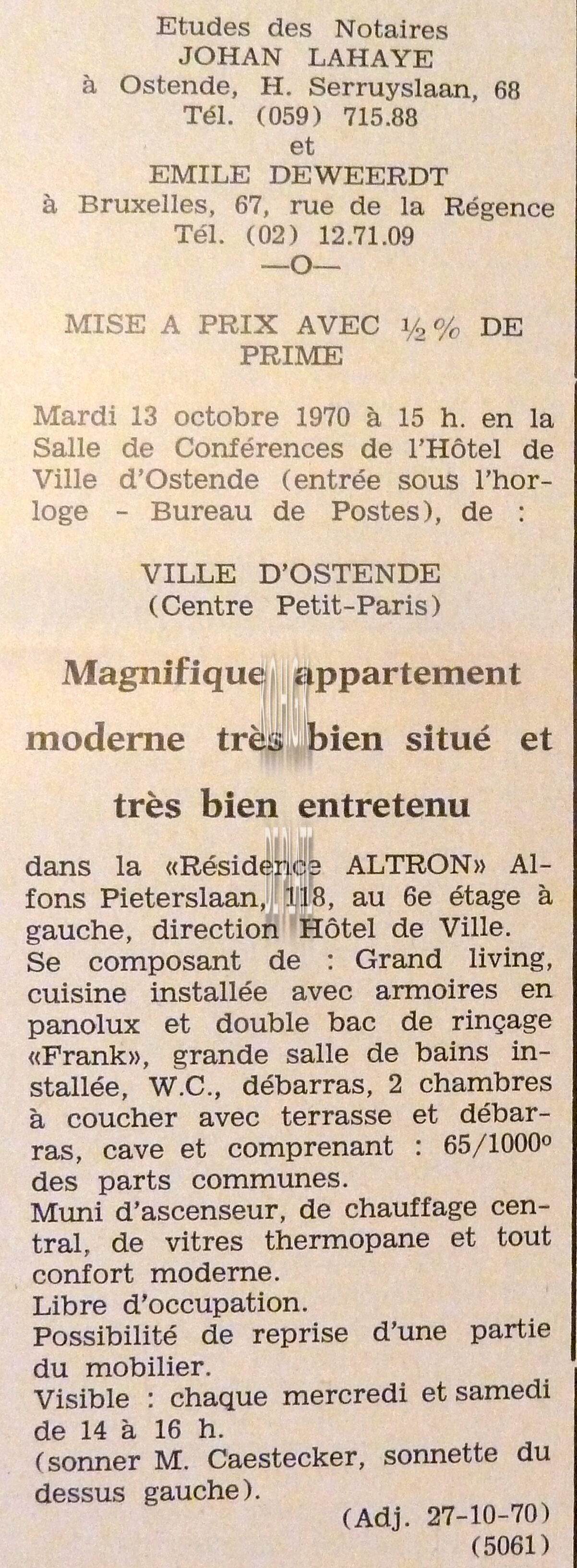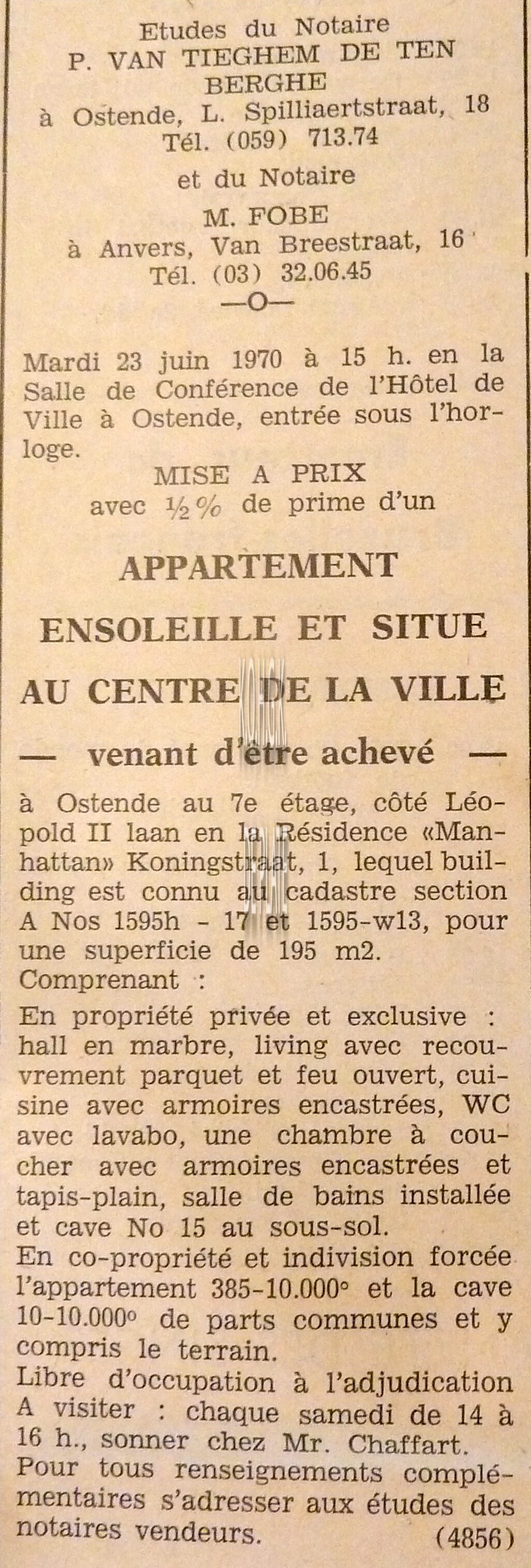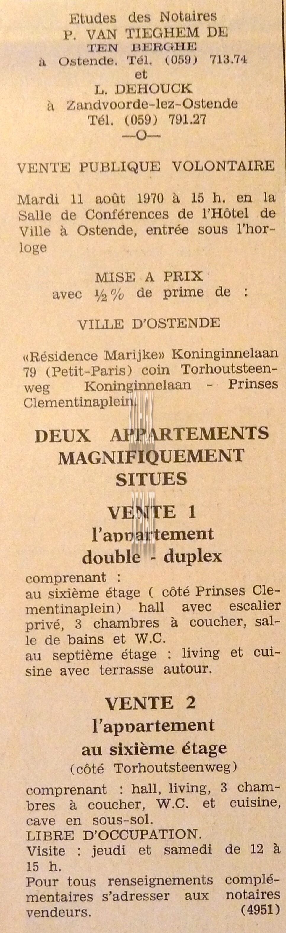 Advertentie : Etudes des notaires P. van Tieghem de ten Berghe et L. Dehouck. Vente publique. Deux appartements. "Résidence Marijke" Koninginnelaan 79. Vente 1 : L'appartement double - duplex sixième étage. Vente 2 : L'appartement sixième étage.