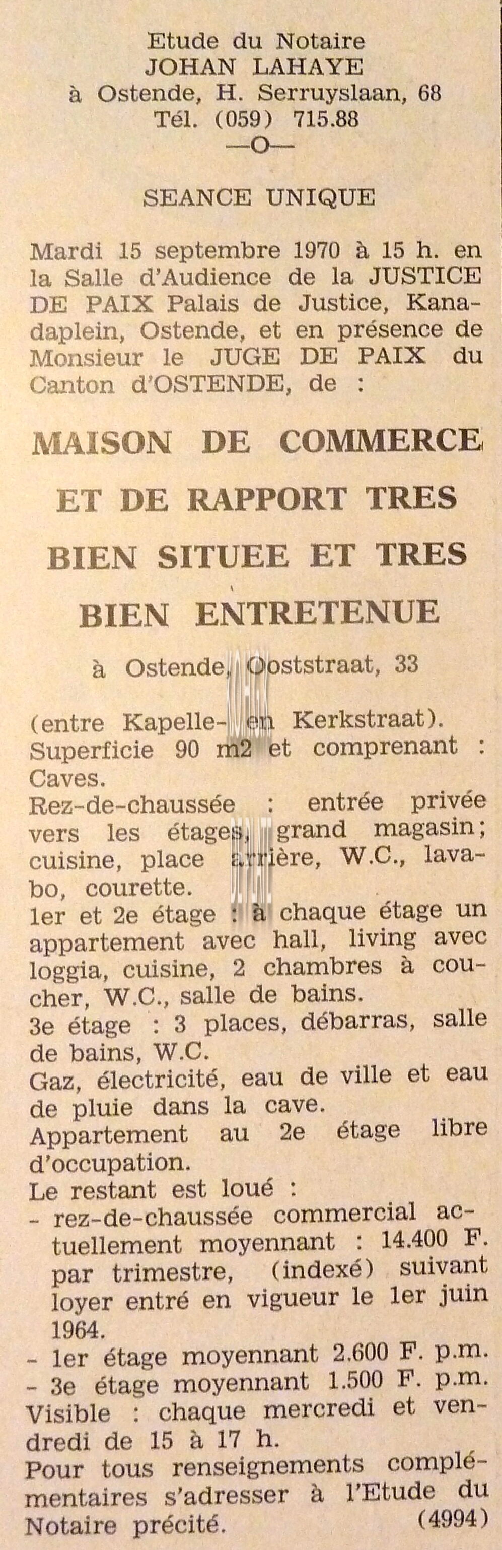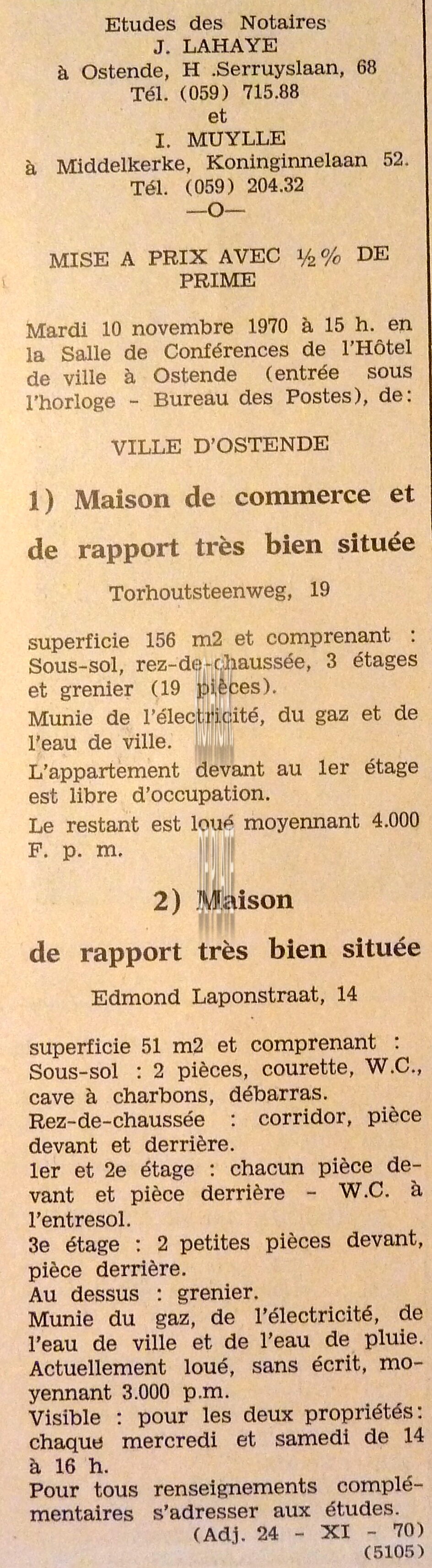 Advertentie : Etudes des notaires J. Lahaye et I. Muylle. Vente publique. 1 : Maison de commerce et de rapport. Torhoutsteenweg 19. 2 : Maison de rapport. Edmond Laponstraat 14