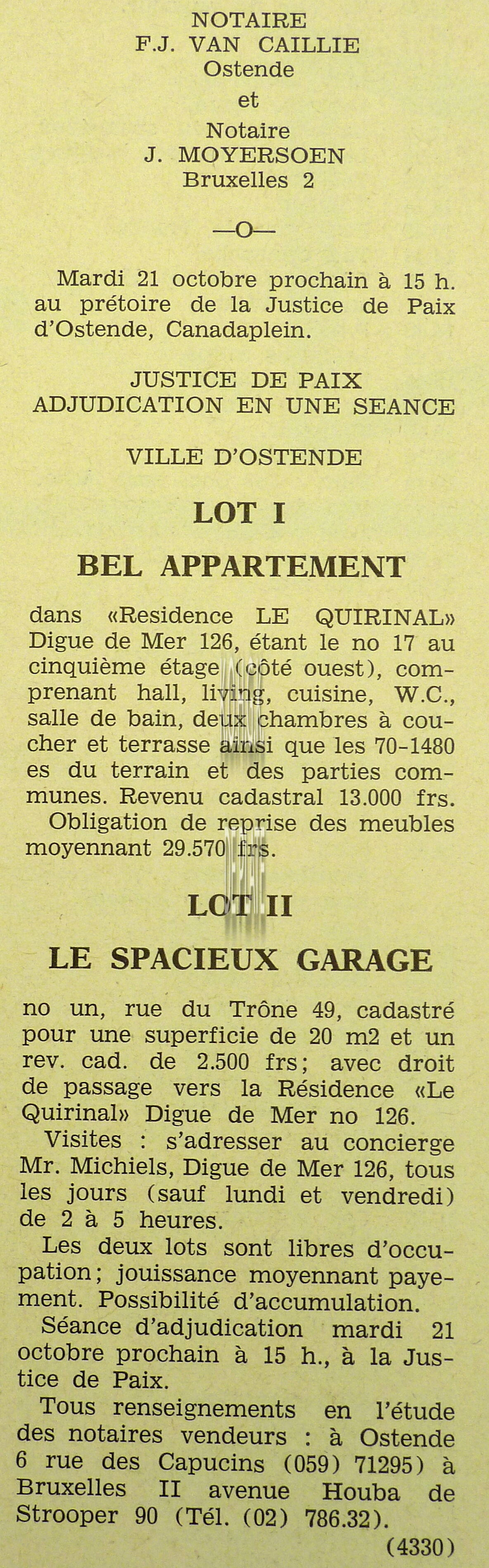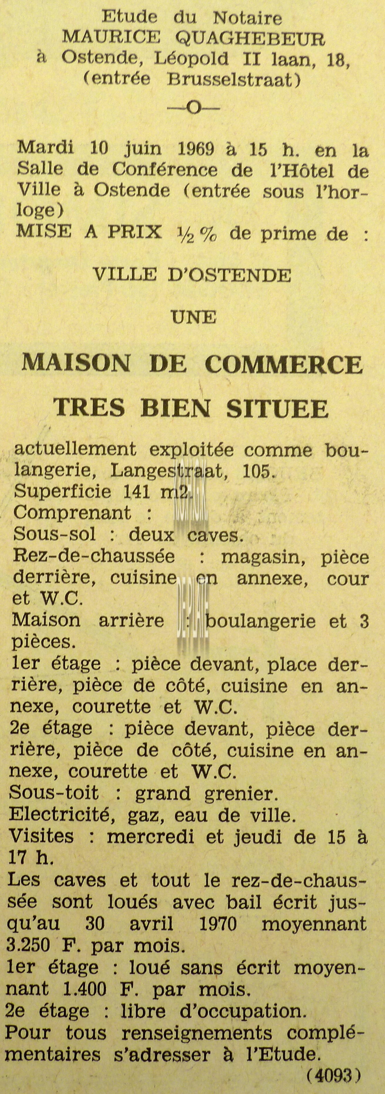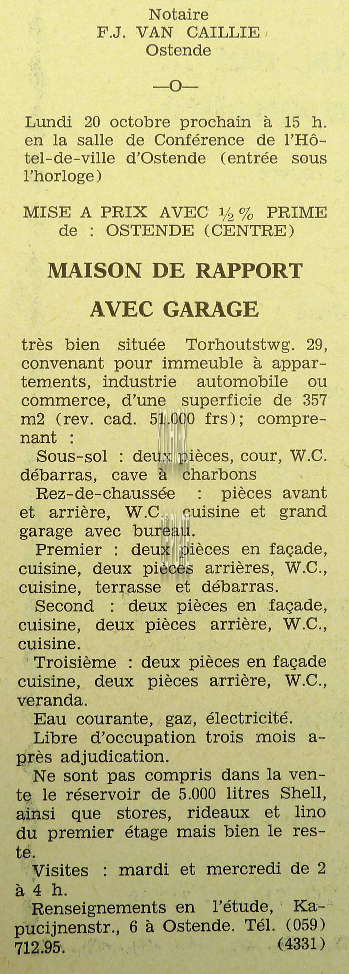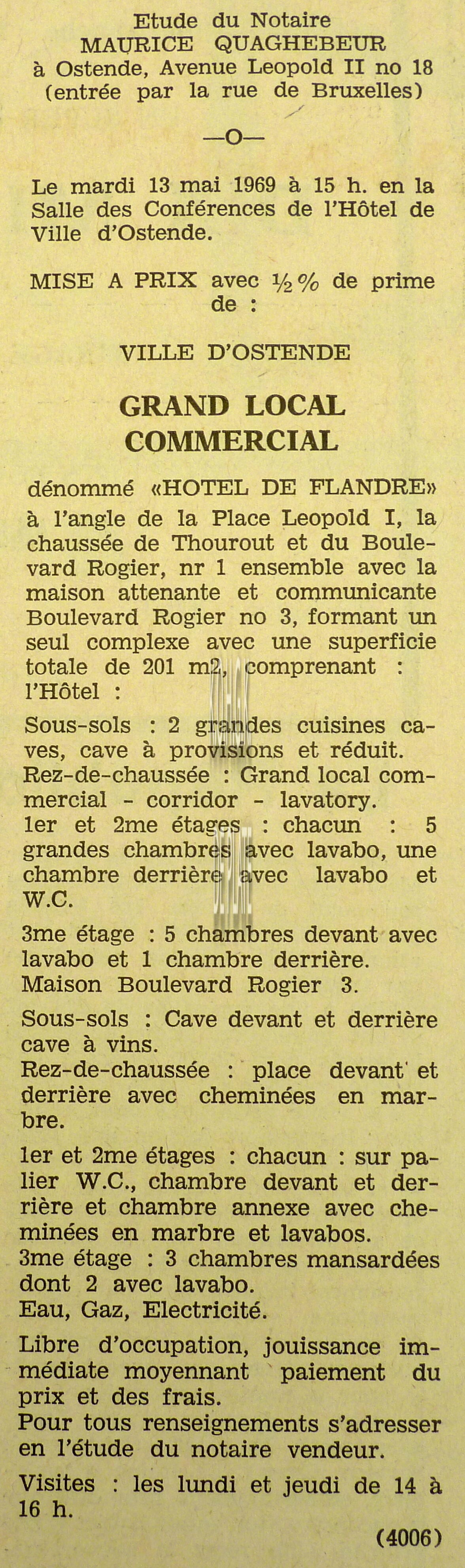 Advertentie : Etude du notaire Maurice Quaghebeur. Vente publique. Grand local commercial dénommé "Hotel de Flandre". A l'angle de la Place Leopold I, la chaussée de Thourout et du Boulevard Rogier 1.